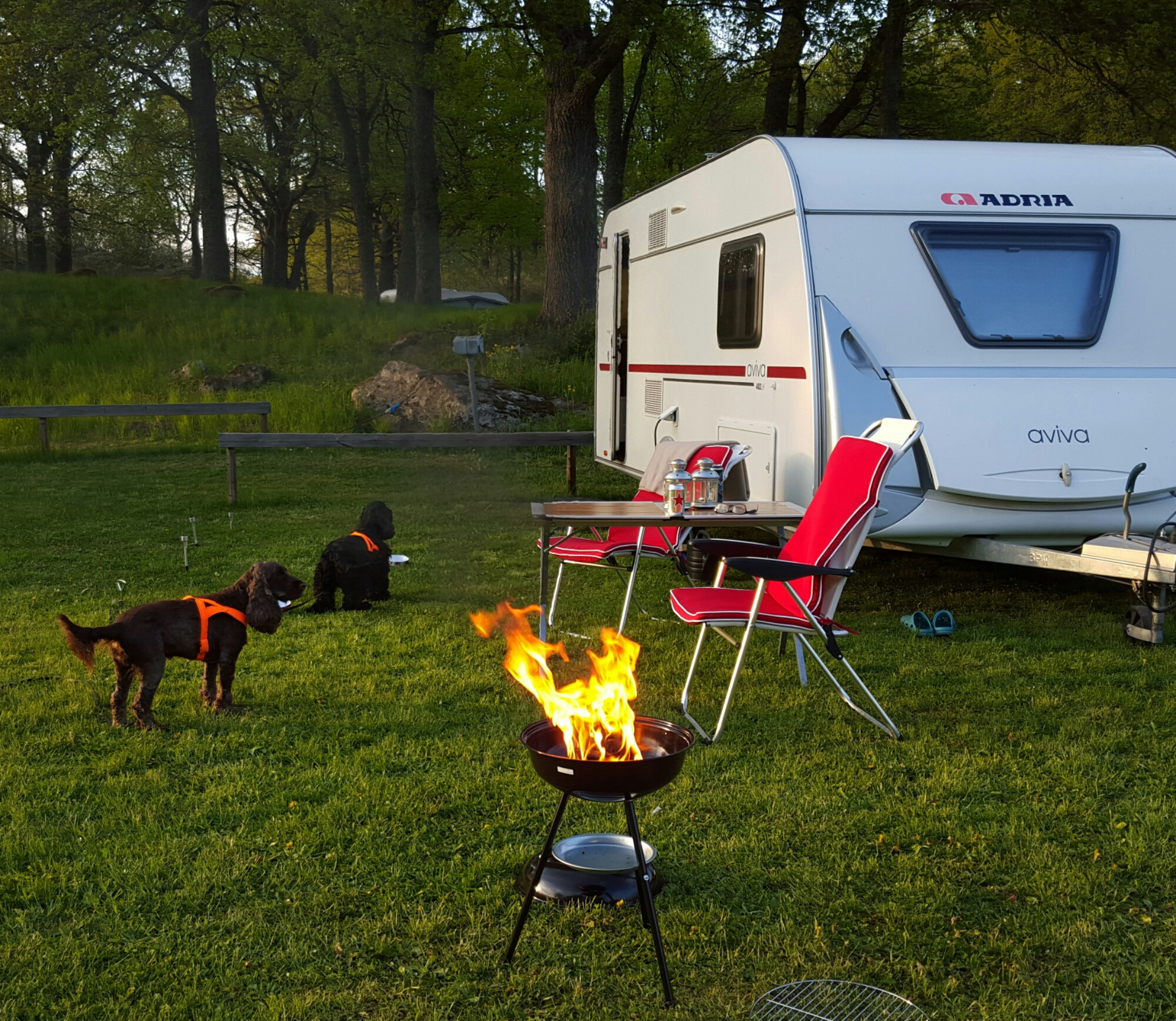 Här är vi nu installerade, fick en toppen plats med långt till närmaste granne. Pelle har grillat korv och nu har vi precis käkat och druckit ett glas vin. Mysigt värre. Svårt att sätta fingret på vad det är som gör det så mysigt med camping. Tror det är friheten och enkelheten. Man är liksom här och nu.
