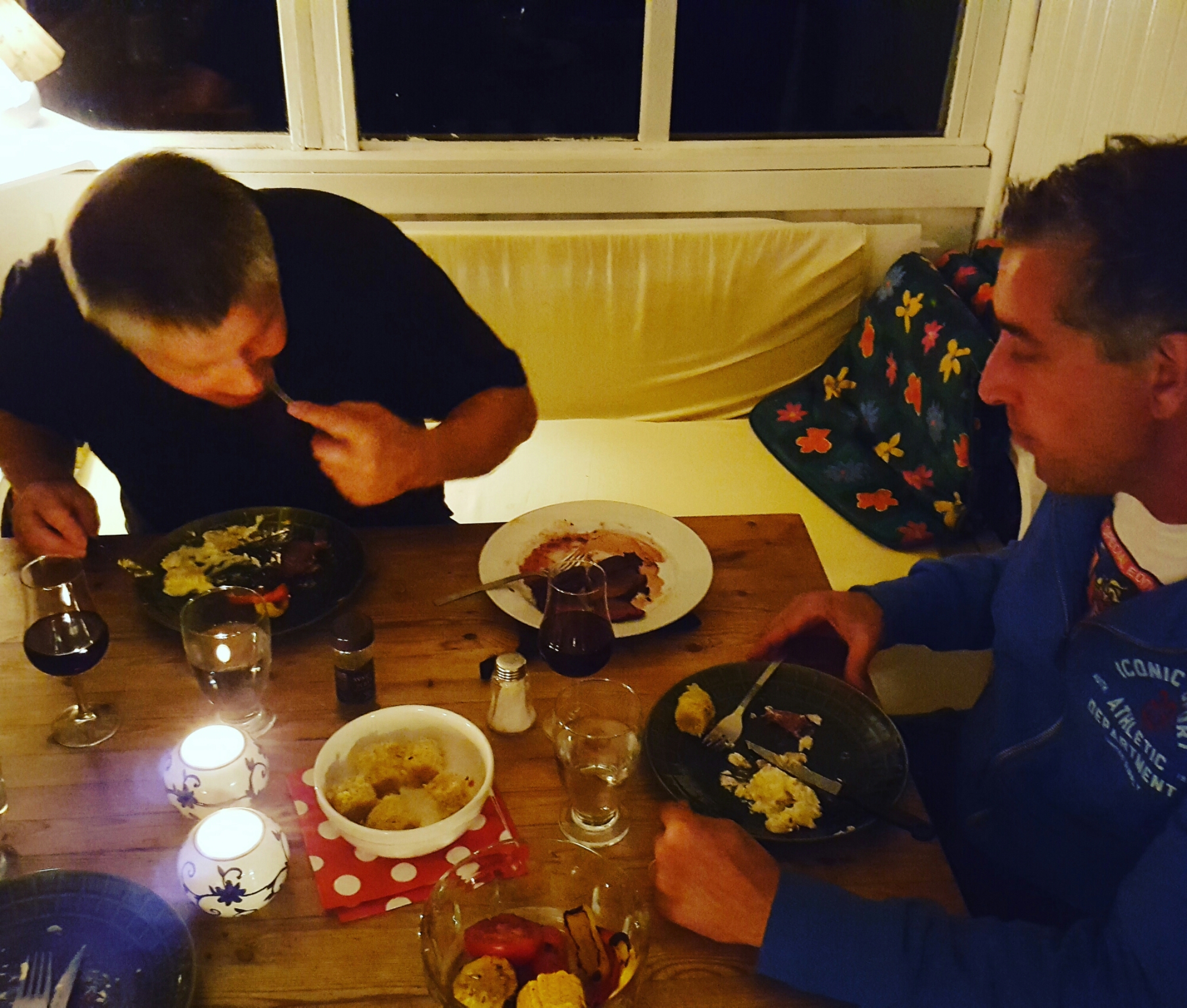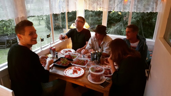 På fredagen käkade vi Dovhjortsentrecôte och det var ju hur gott som helst. På lördagen kom Åsa och Peter. Senare kom Sabrina med familj – inklusive lille Theodore. Jätteskoj att träffa en ny familjemedlem. Åsa och jag gick på fotosafari och Pelle hittade svamp. På kvällen kräftskiva – jag käkade paj.