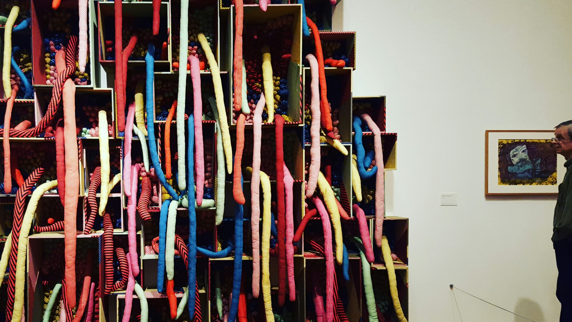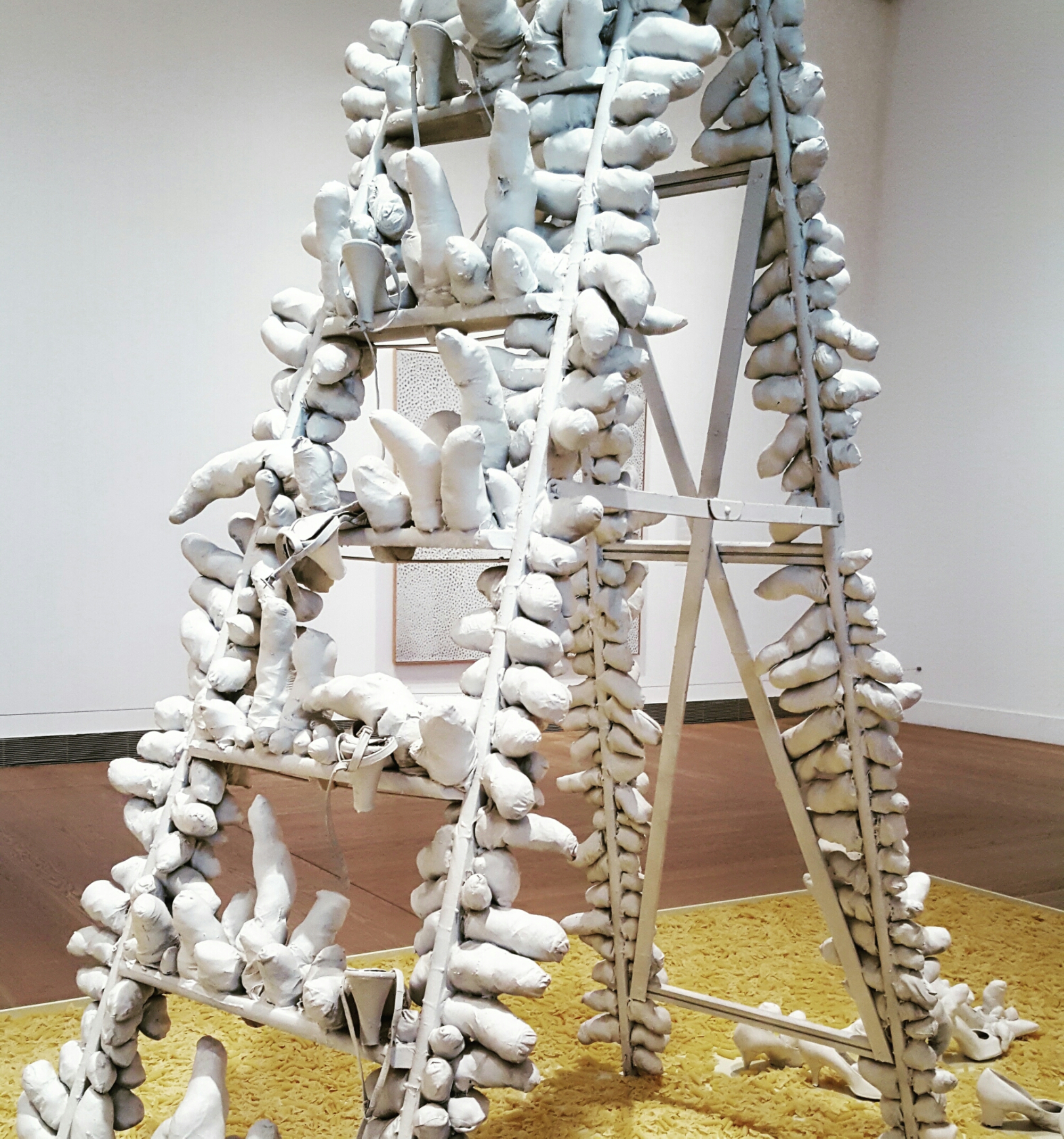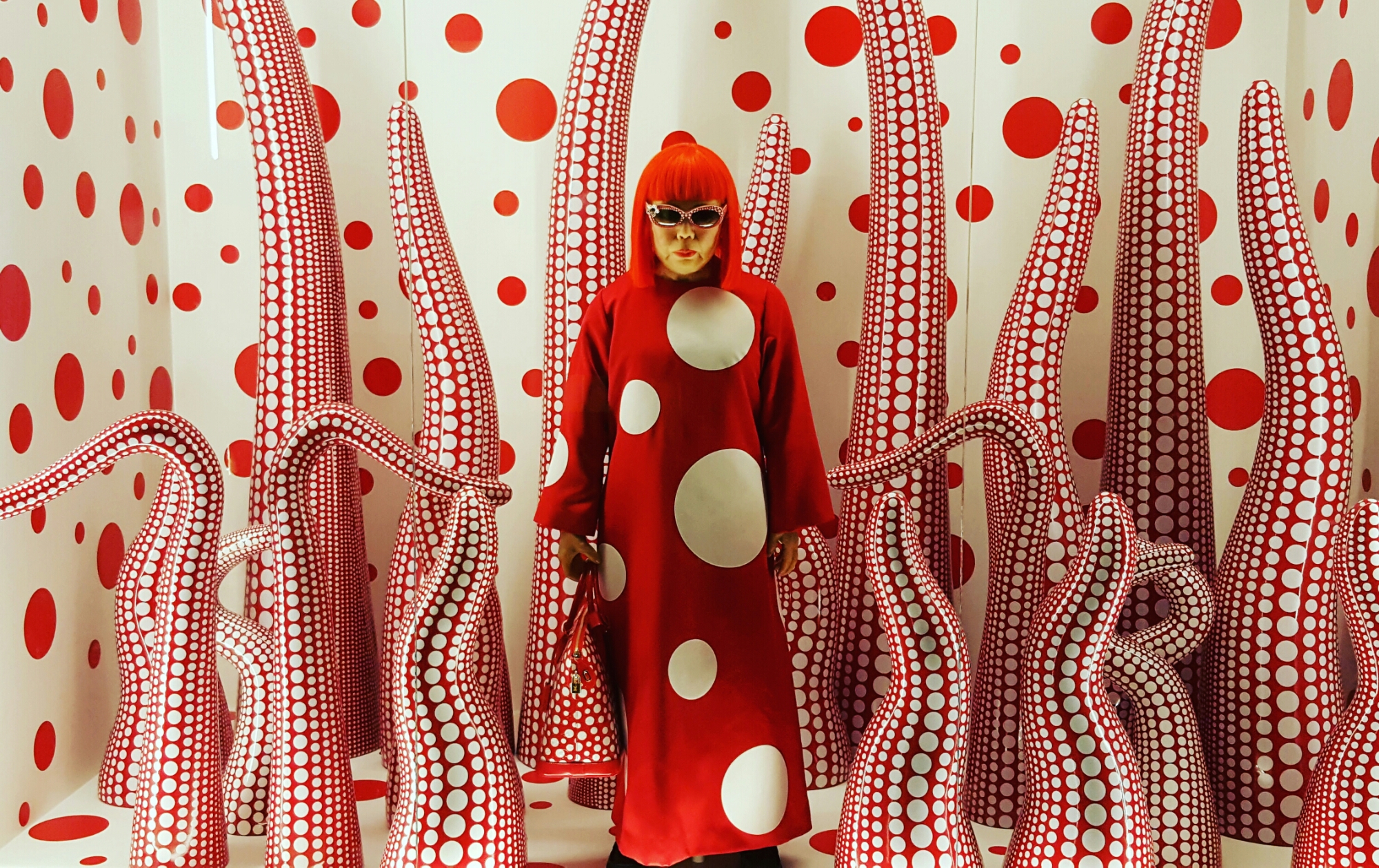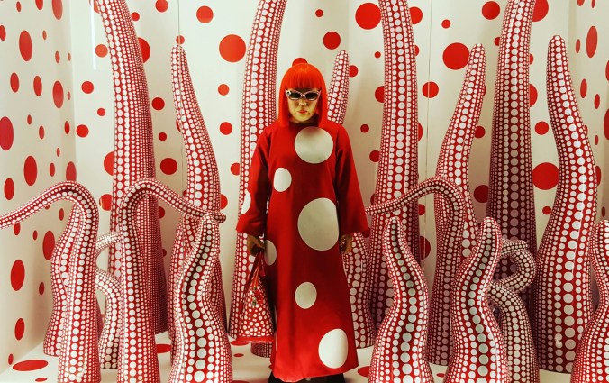 Yayoi Kusama är en japansk bildkonstnär och författare. Hennes konst är en blandning av måleri, skulpturer, installationer och design i olika material. Influenser från öst och väst blandas. Prickigt gick som en röd tråd genom utställningen kombinerat med lite avlånga snoppliknande pryttlar. Coolt!