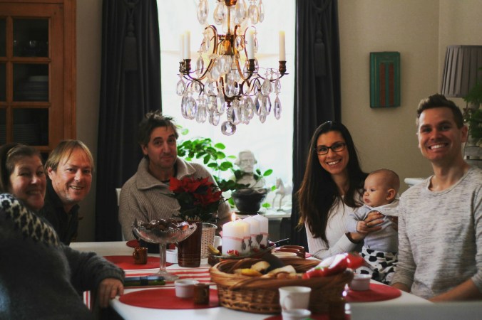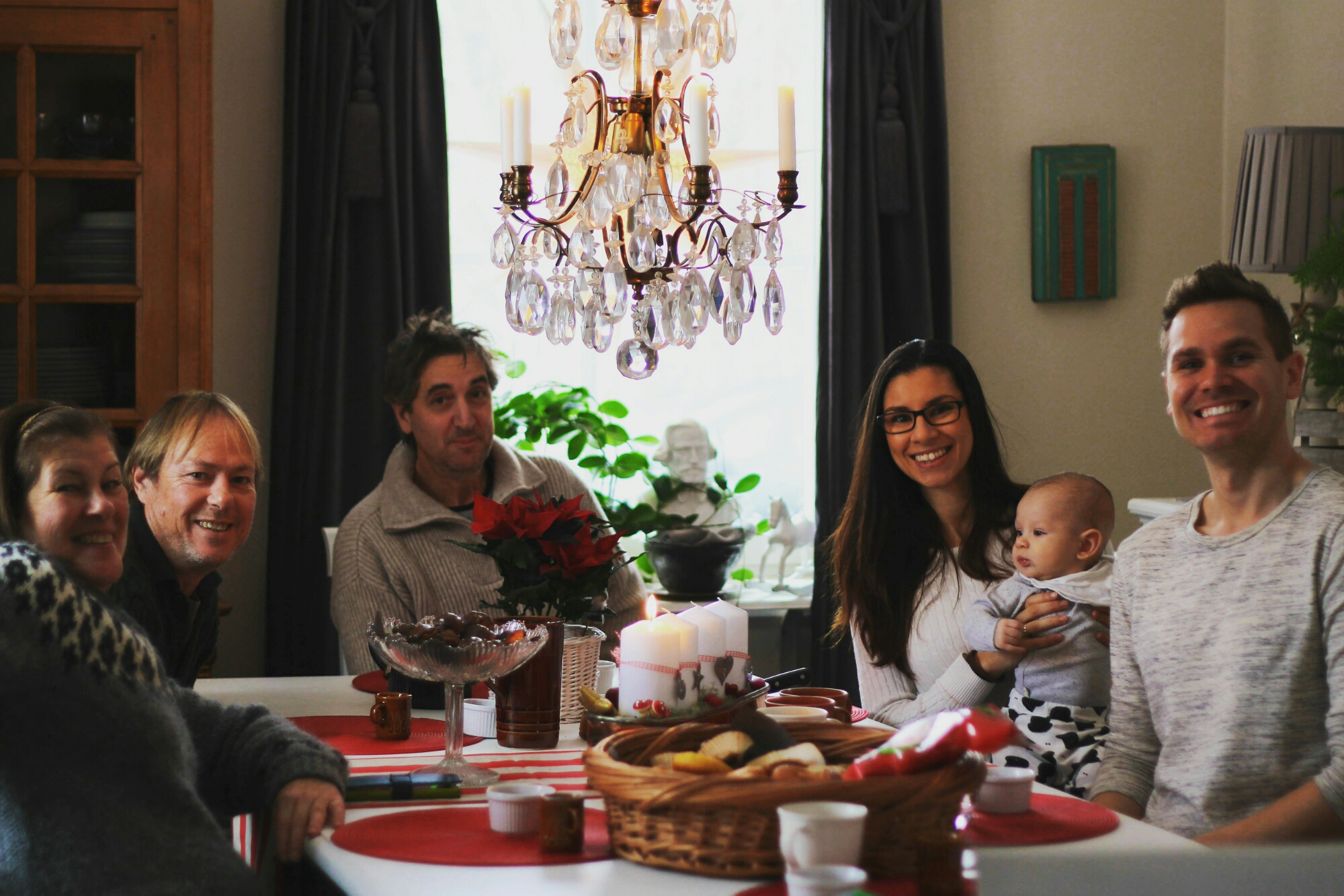 Traditionsenligt och mysigt första adventsfirande med Åsa, Peter, Sabrina, Mattias och lille Theodore. Medan vi mumsade på Pelles hembakade biskvier med mera, stormade det och snön yrde utanför.