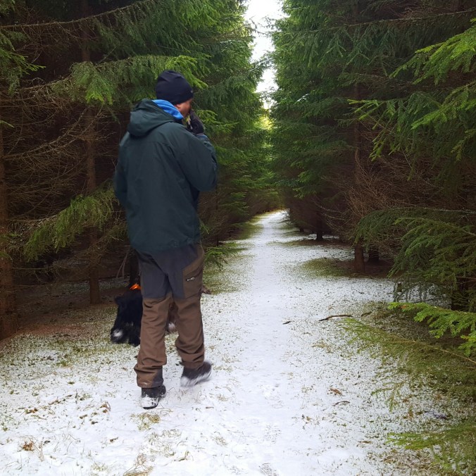 Snö och solsken – fin dag. Så vackert bland granarna som var så små när vi flyttade in här för snart 15 år sen..