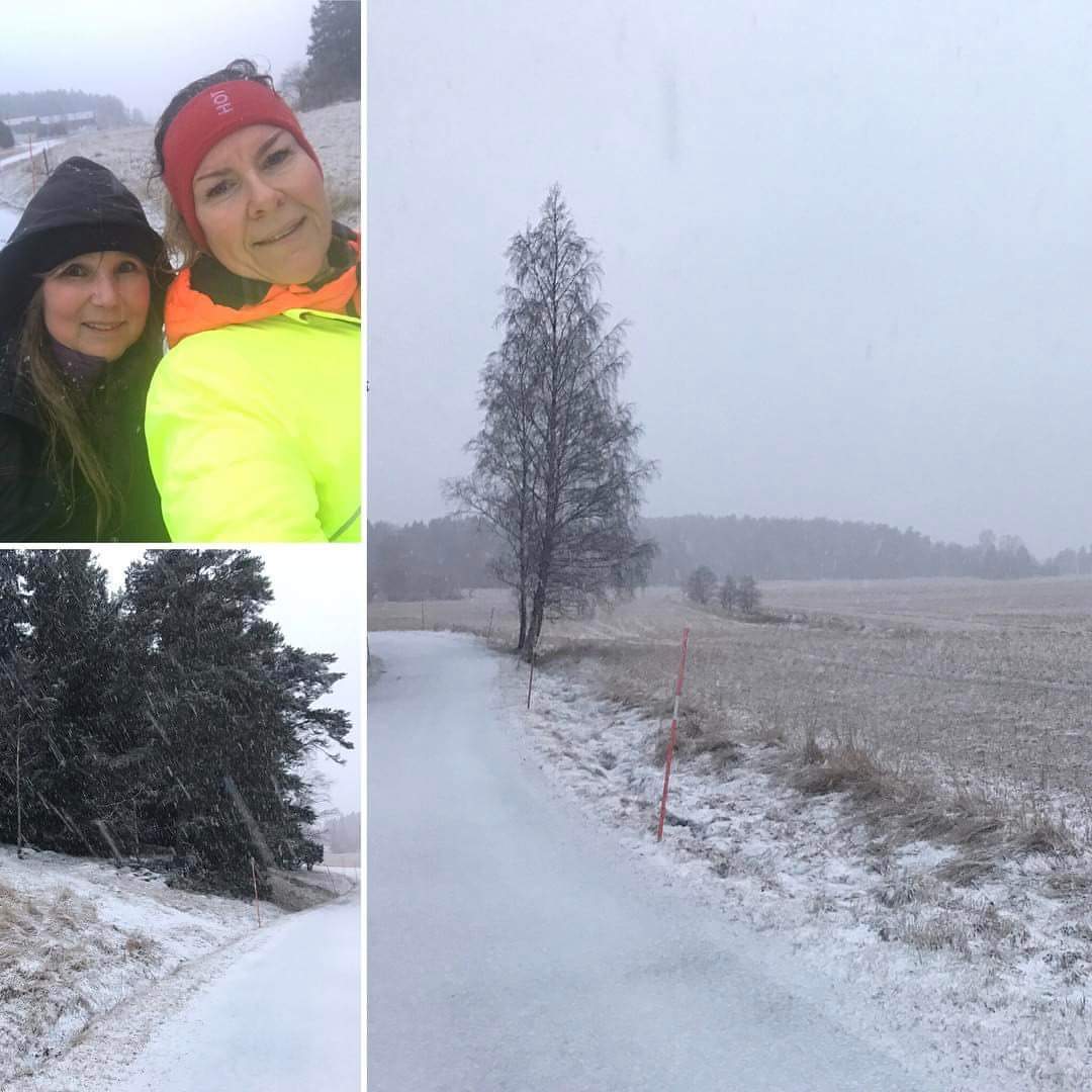 Det snöade imorse – sån där blöt snö som ofta smälter bort – vilket var fallet även idag. Lotta och jag promenerade vår runda oavsett väder och vind. Väl hemma hade vi rosiga kinder.