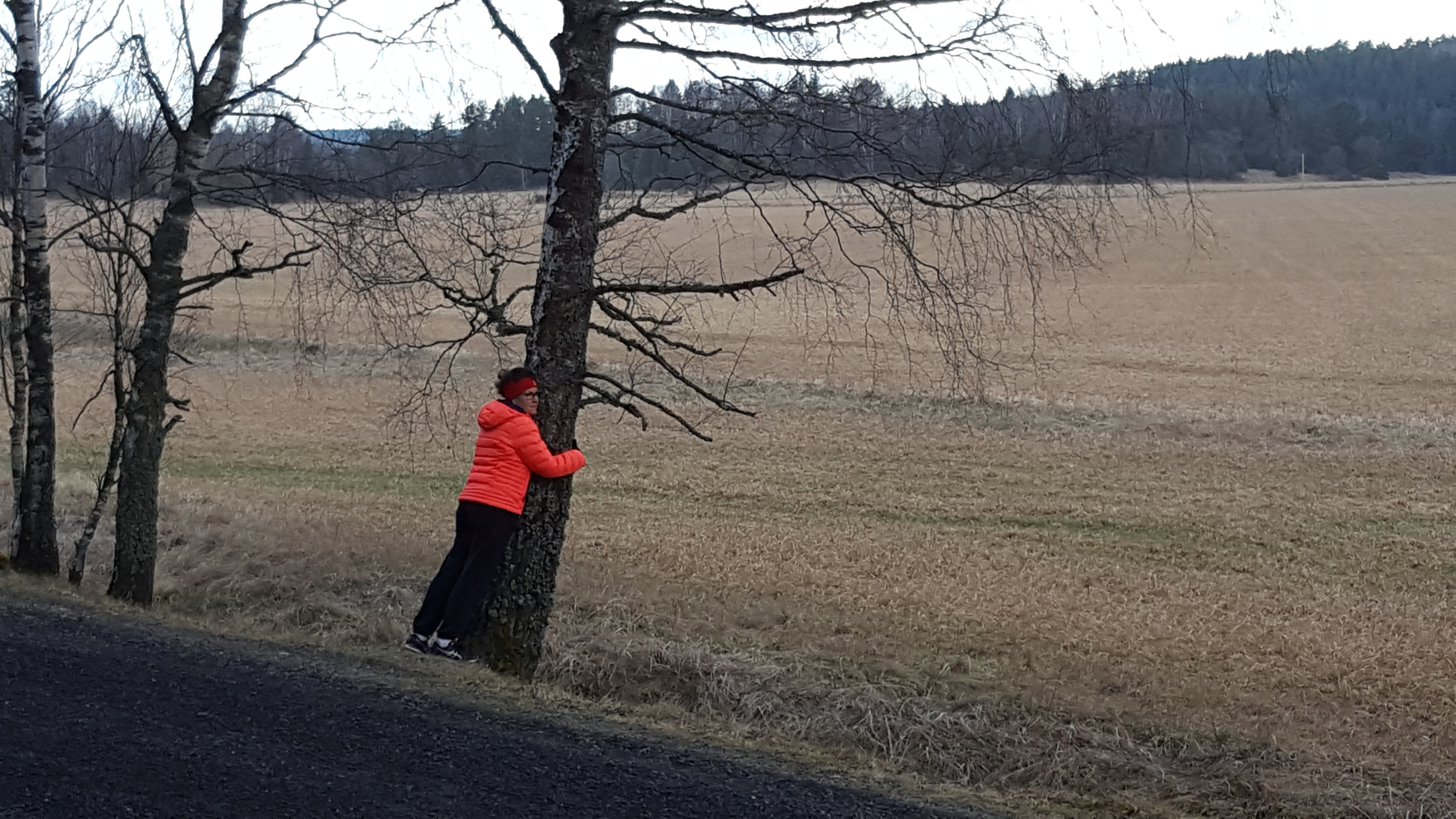 Imorse försov jag mig – och så hade jag ont i ett knä. När jag kom ner till Lotta så tänkte jag först vända hem igen. Men Lotta som bland annat är massör- tryckte lite på min vad och vips så var smärtan borta. Hade inte kunnat tänka mig att det skulle hjälpa så på en gång? Tack Lotta! Sen gick vi en timme utan problem. Hann också krama ett träd.