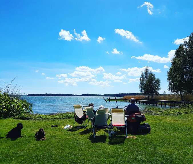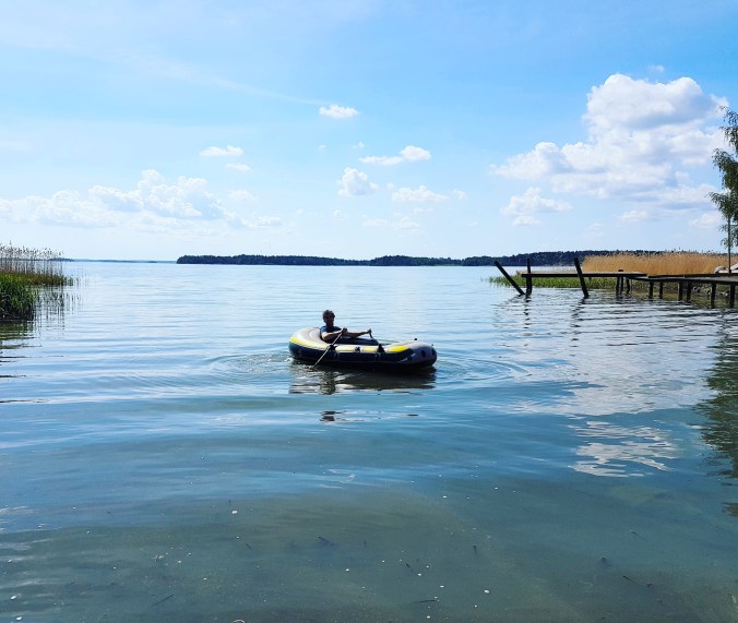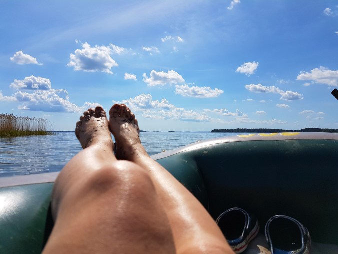Sen idag sken solen och vi var ute hela dagen. Hängde nere vid stranden – rodde lite med gummibåten.