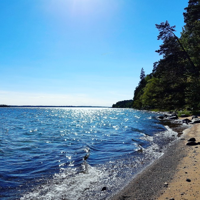 Hem åkte vi över Nävekvarn – besökte en vacker strand vi hittade förra sommaren.