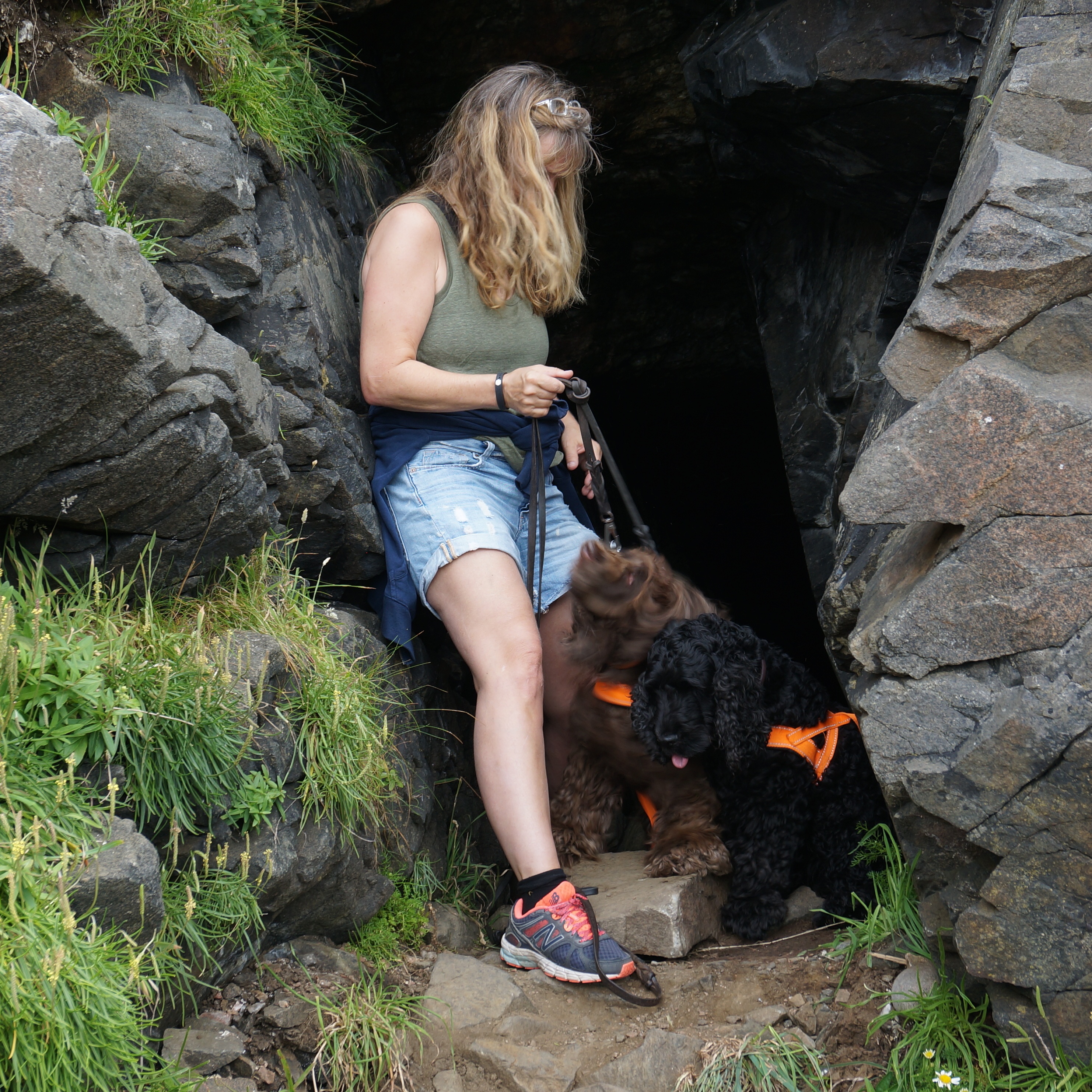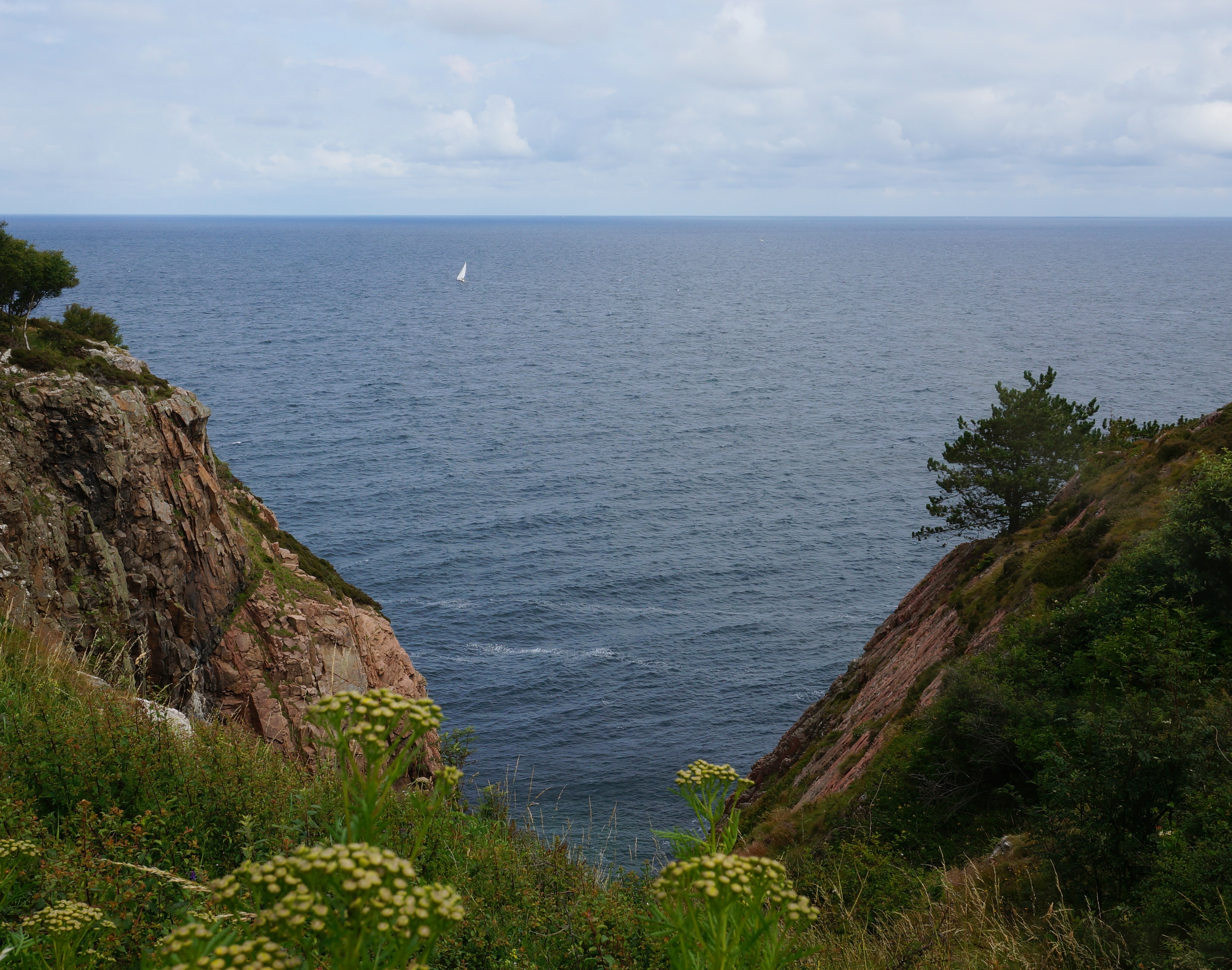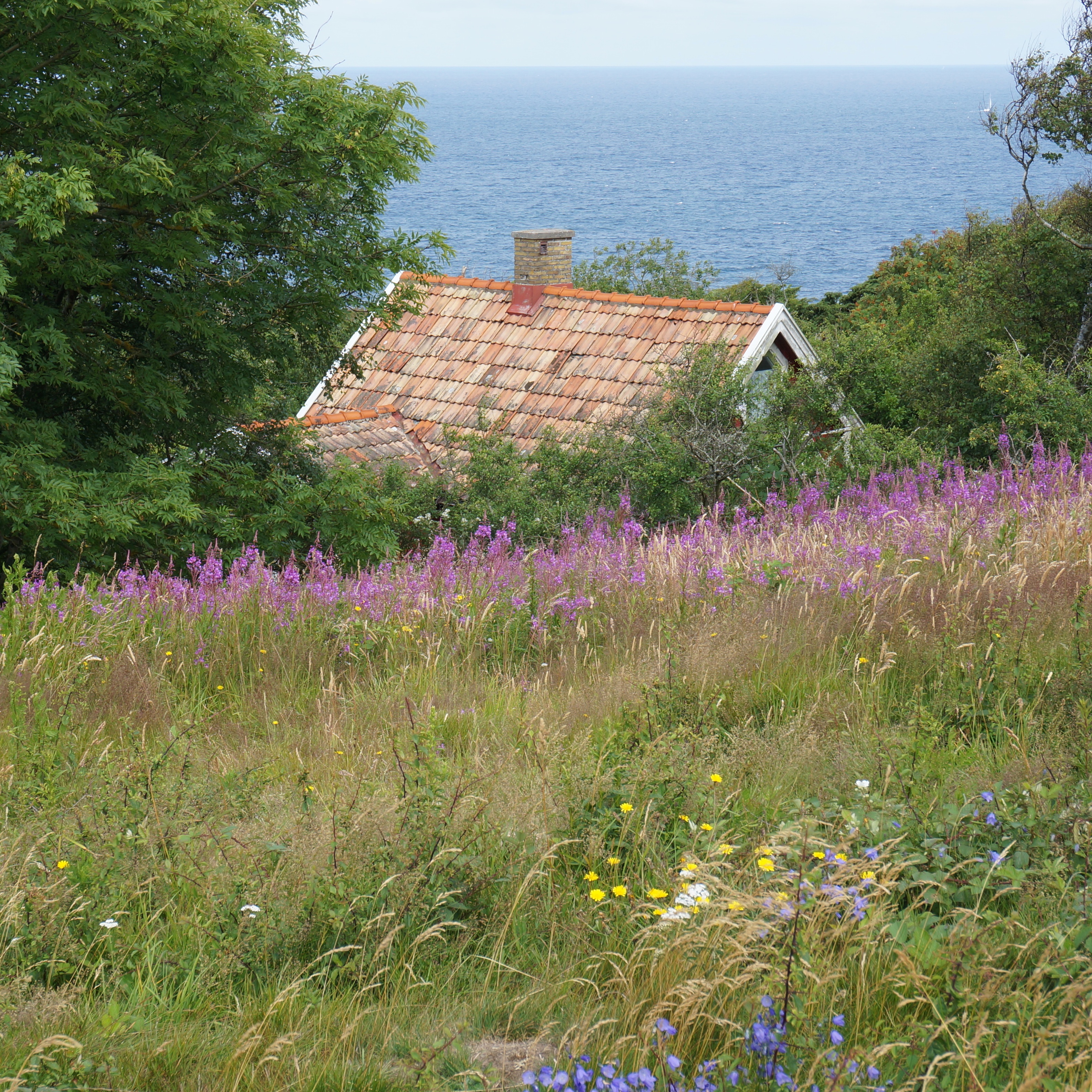 Vi packade ihop och lämnade campingen utanför Mölle. Sen åkte vi till Kullabergs naturreservat och klättrade bland branta klippor – allt för att få se en av alla grottor där. Där finns en fyr – Kullens fyr – inte särskilt vacker – men ändå.