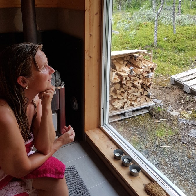 Vi åkte till hennes fjällstuga – och där väntade en vedeldad bastu med björkved… det doftade så gott – tänk om man kunde spara den doften på burk.! Utsikten från bastun var fantastisk.