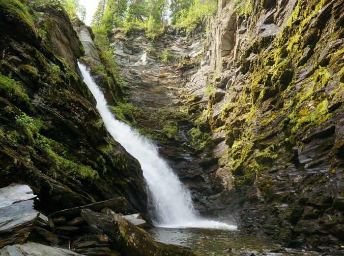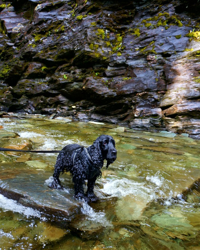 Sen fortsatte vi mot Stora Blåsjön – vägen gick ovanför sjön och det var galet vackert. I närheten besökte vi ett vattenfall – nummer fyra under denna resa tror jag, Brakkåfallet. Hundarna badade och flöt med strömmen, härligt.