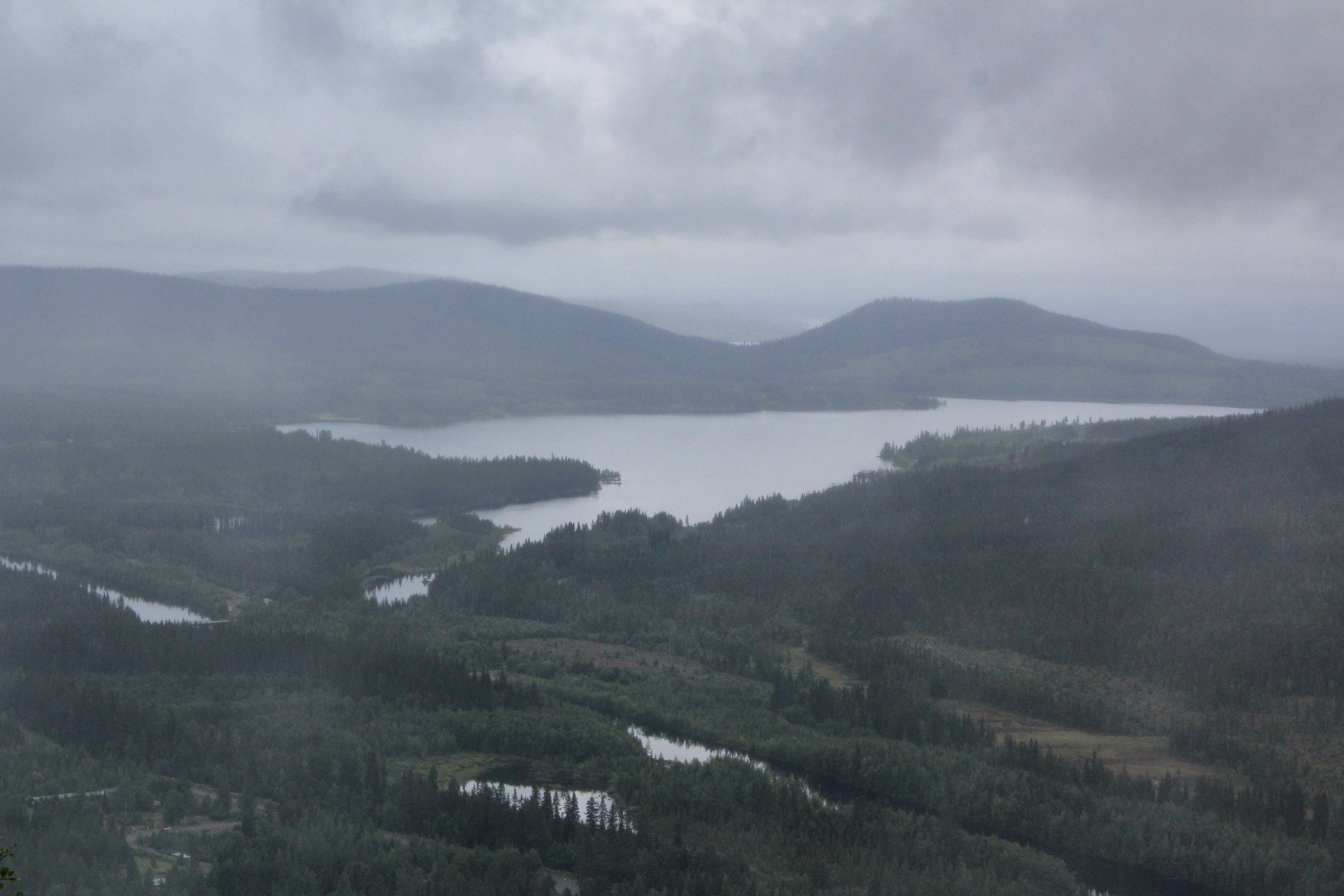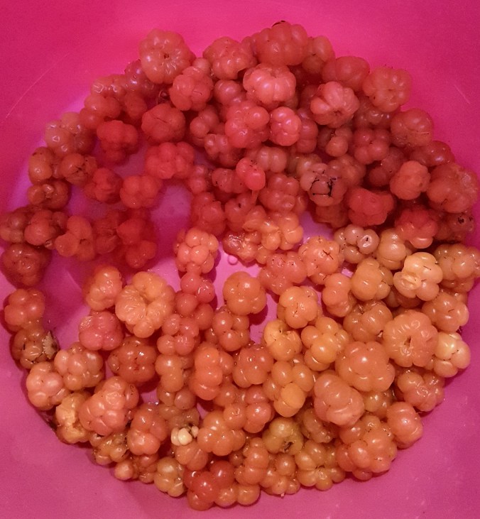 Vildmarksvägen var lika vacker idag! I Stalon besökte vi en utsiktspunkt. Tyvärr var det dimmigt, men vackert ändå. Några hjortron hittade vi idag – räcker till en dessert.