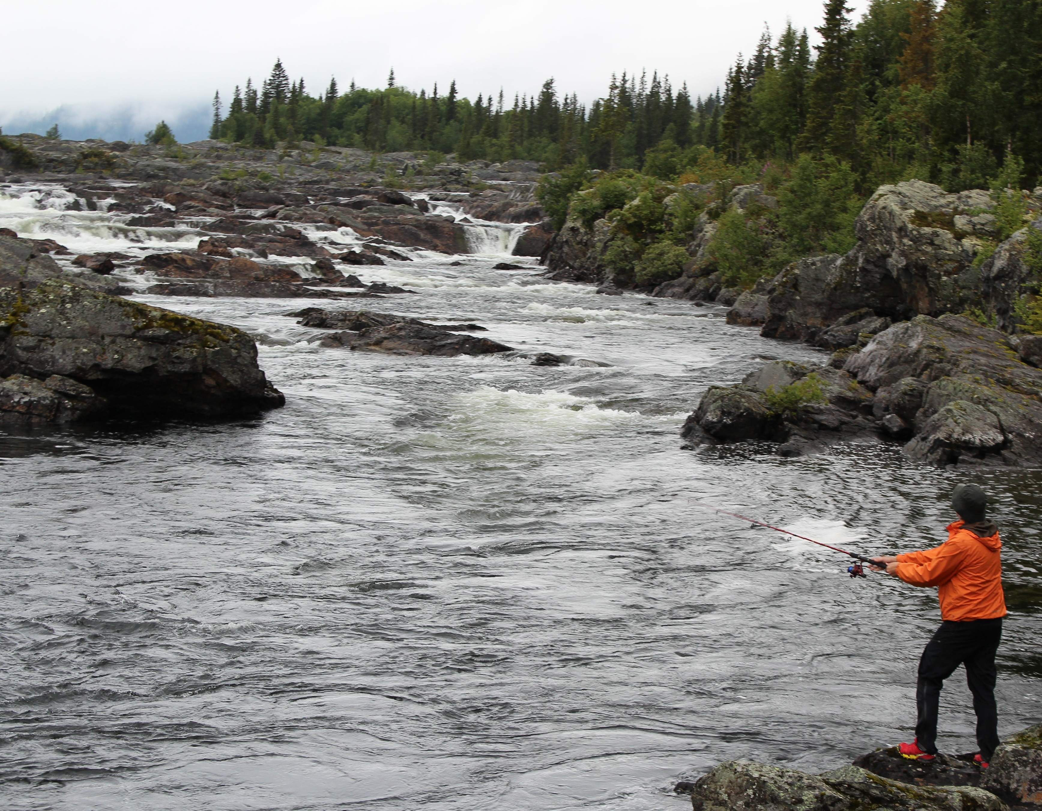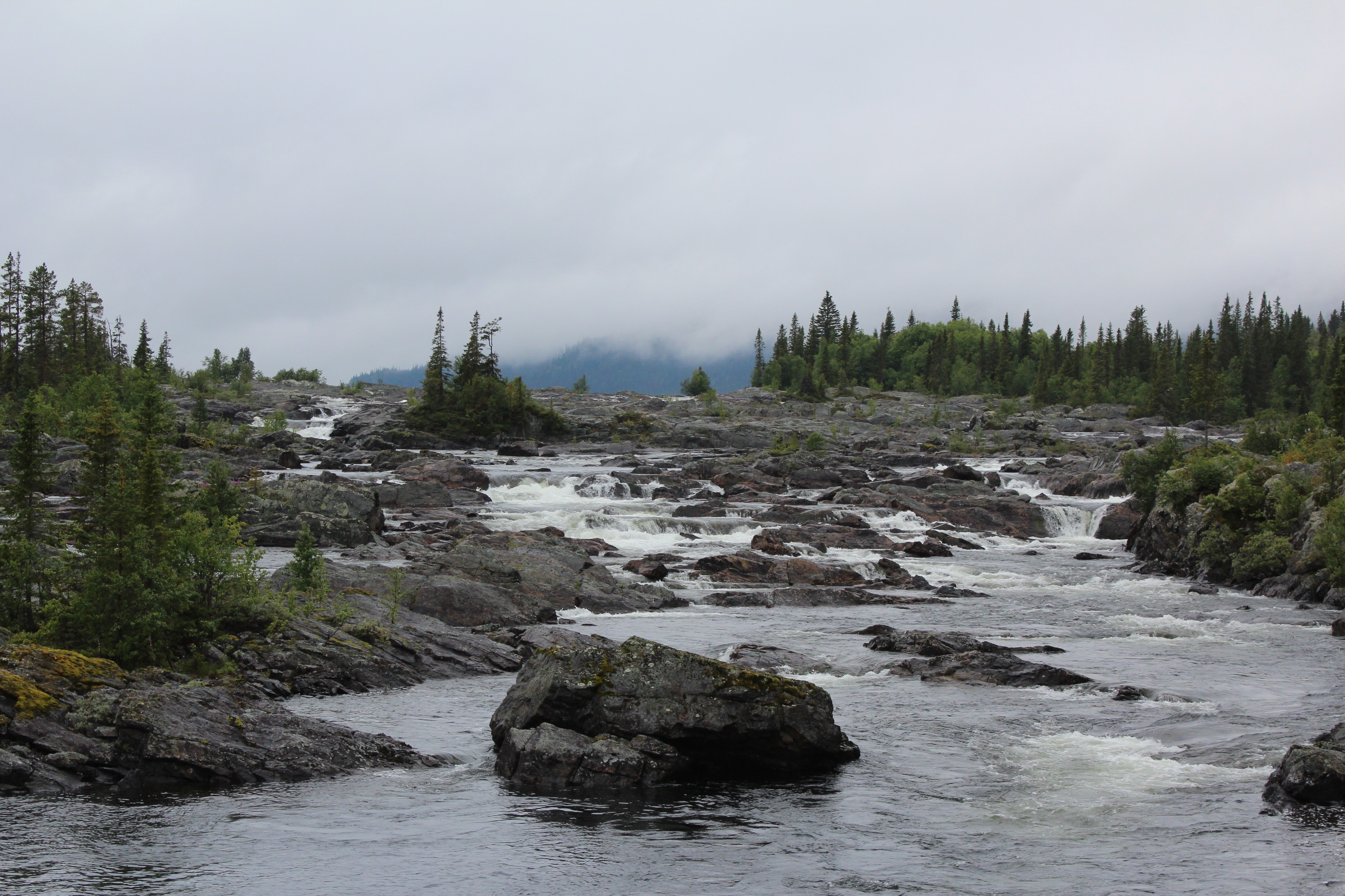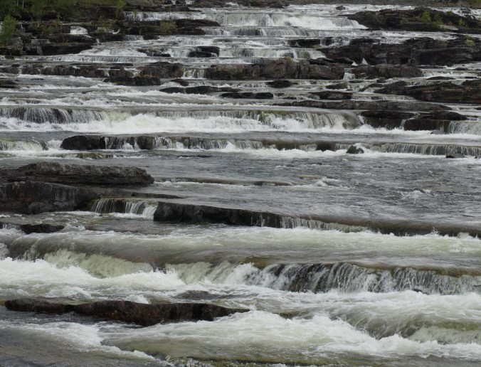 Inatt campade vi på en väldigt trist camping i Marsfjäll – tror det var ett ”skoterhotell” med ställplatser. Det var Pelle och jag och så en husvagn till. Så i morse gav vi oss av ner för fjället mot Vilhelmina. På vägen stannade vi många gånger och beundrade vackra ställen, som trappstegsforsarna.