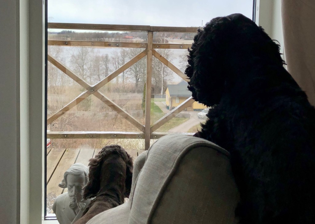 Det är inte bara Pelle och jag som stortrivs här. Även Stilton, Cheddar och Snöret uppskattar vyerna. Stilton spanar på fåglar.. Det blåser och stormar så det går vita gäss, det knakar i väggarna – men vi har det bra!
