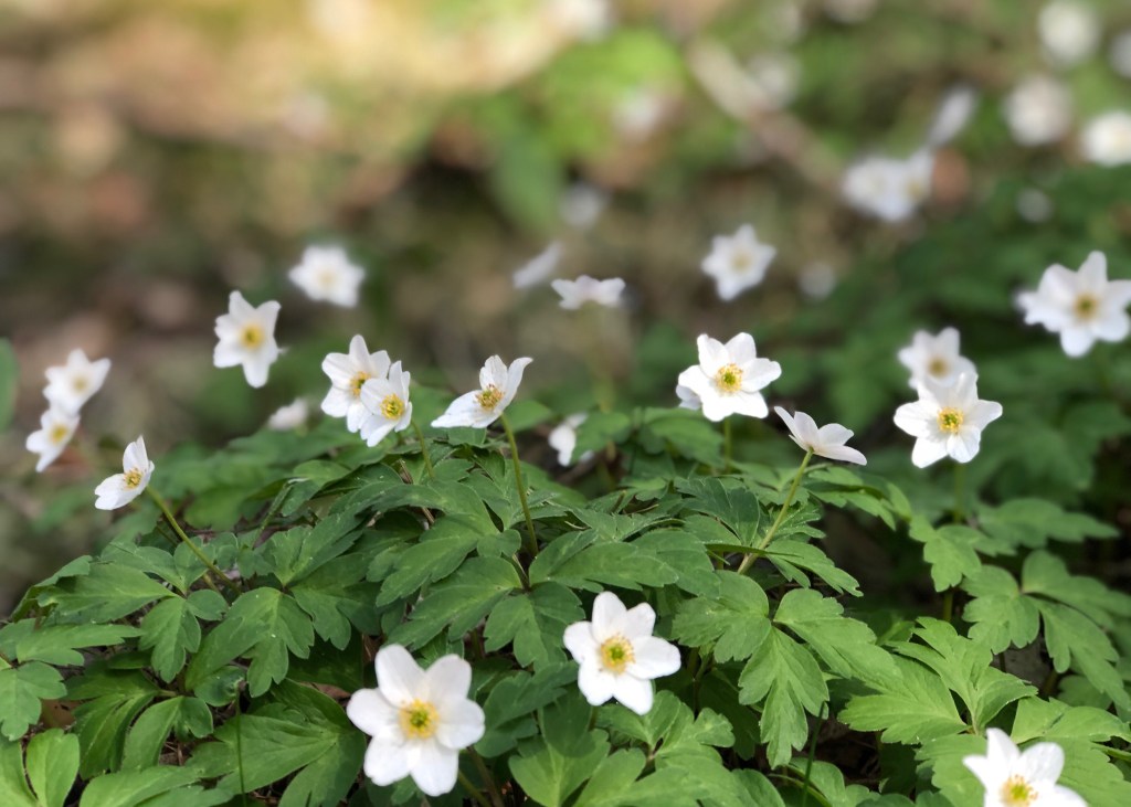 Vitsippor såg vi massor, vi har också fortfarande fullt av dem här hemma på tomten. Sen såg vi skogsvioler – växte i stora grupper långt in i skogen.