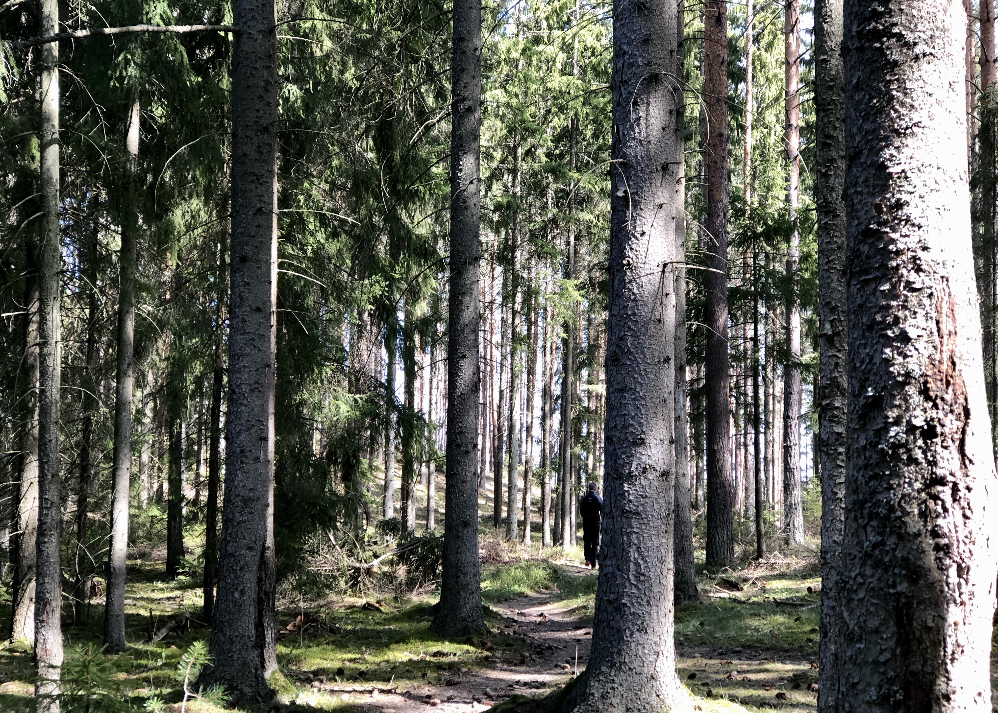 Idag gjorde vi en trevlig upptäckt! Vi hittade en massa härliga stigar att vandra på alldeles här i närheten av där vi bor. Vi var ute en timme idag och fick uppleva våren i lövskog och kuperad barrskog. Jag tyckte det kändes som Kolmårdsskogarna med mäktiga höga träd. Bara det att få vandra längs med Mälaren – säger bara toppen!