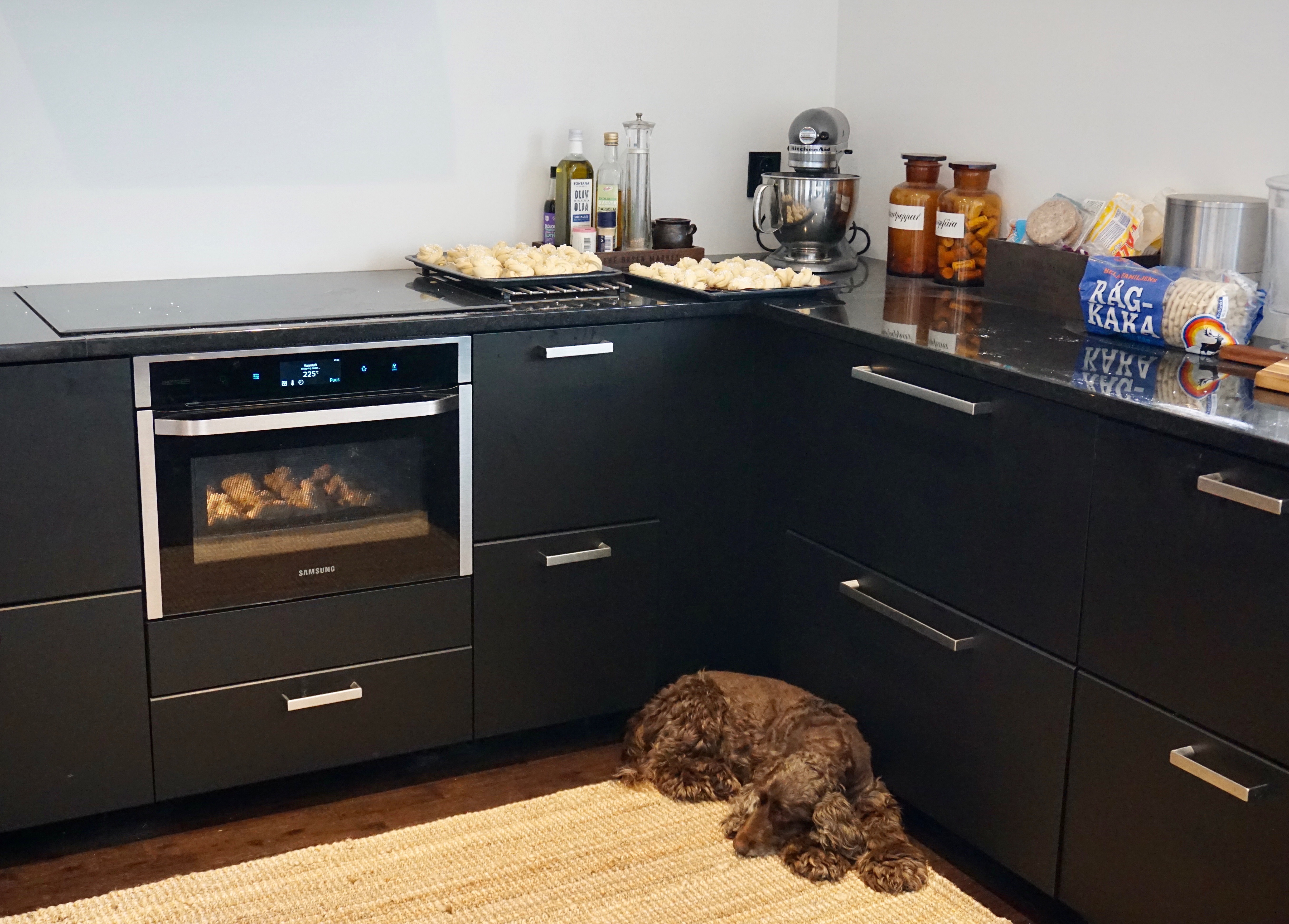Regn och faktiskt lite åska idag – så då passade vi på att hänga inomhus. Jag bakade bullar för första gången i nya huset. De blev så bra – måste bero på ugnen, varmluft.