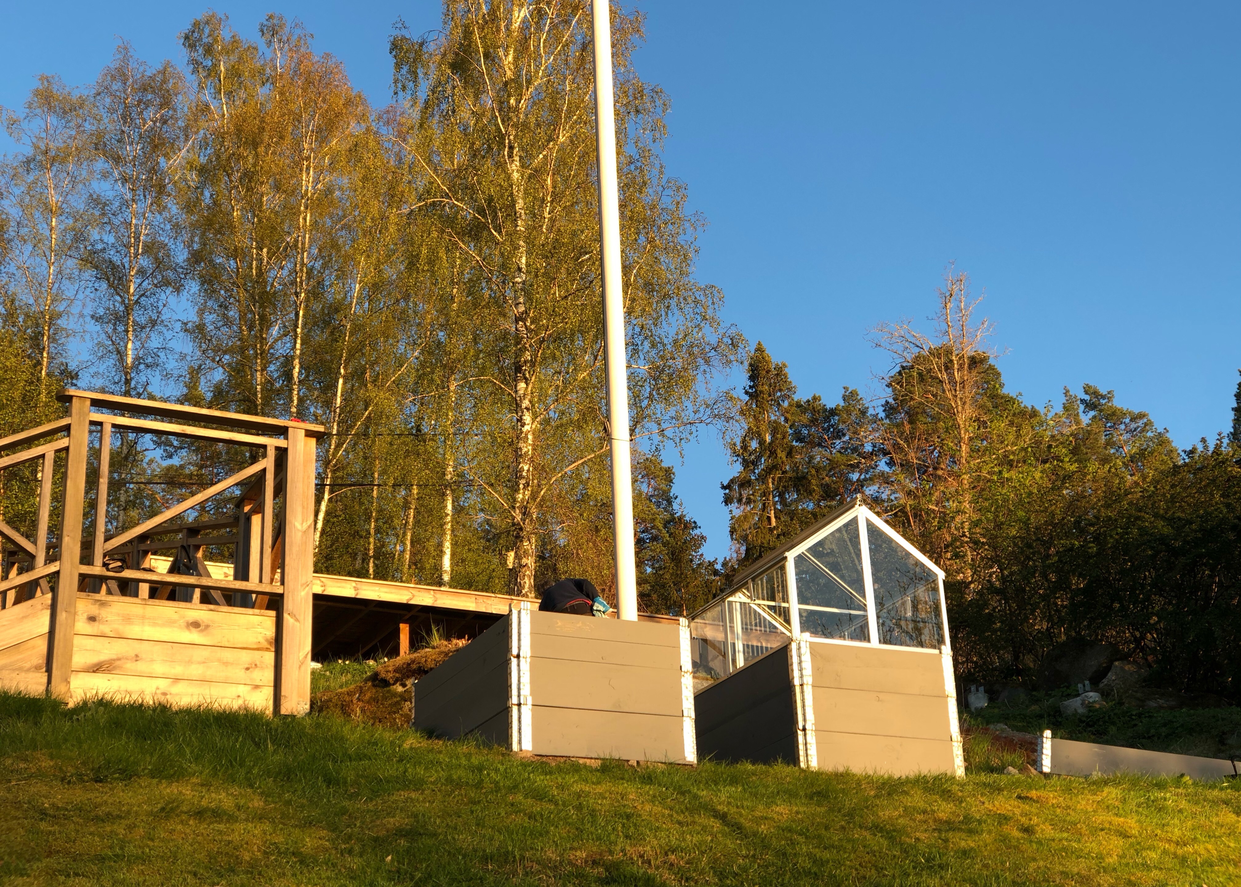 Varför har vi då ett växthus på pallkragarna? Jo, det finns ett gäng rådjur här som verkar käka upp allt som växer.. Troligen blir det två växthus till. Känner mig nöjd så långt..