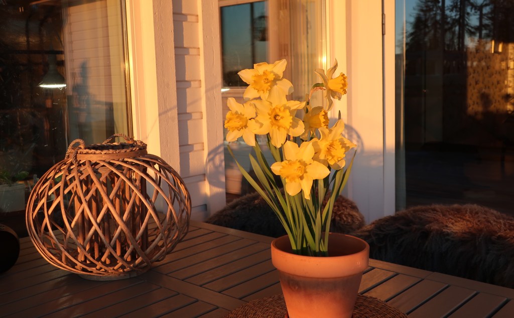 Solen visade sig från sin bästa sida och det var riktig sommarvärme på altanen – skönt. Äntligen trivs blommorna utomhus.