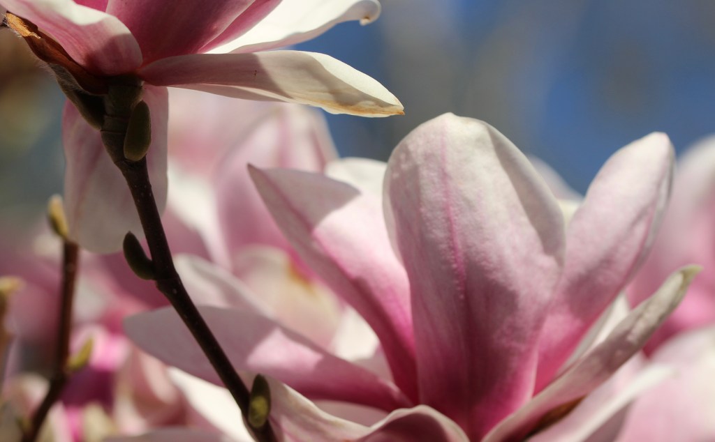 Grannarnas magnolia har slagit ut, den är helt otrolig! Säkert fyra meter hög, planterad någon gång på 50-talet. Undrar när vår magnolia blommar – och om den överlevt vintern?