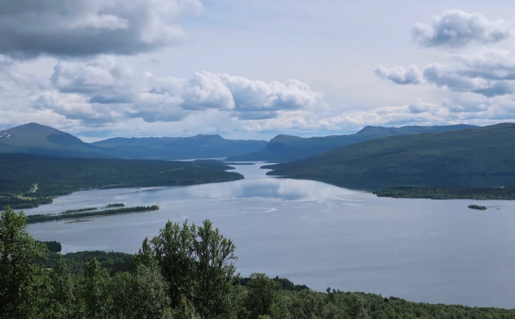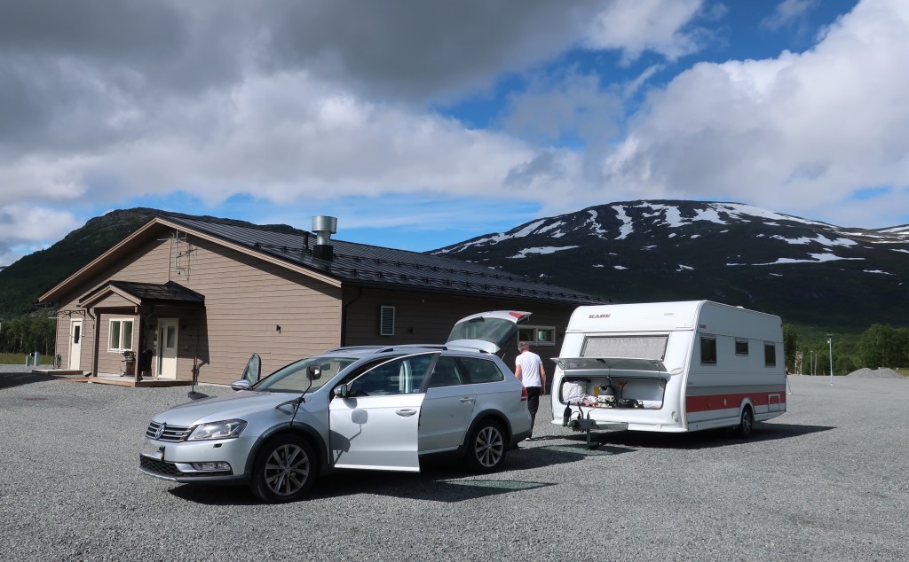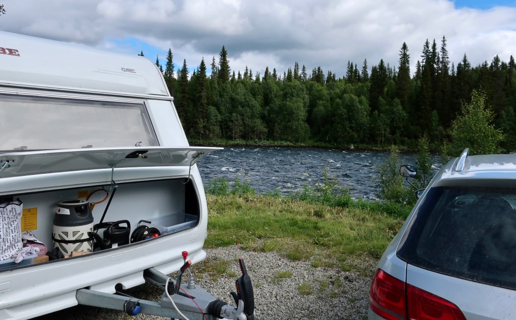 Vi packade ihop oss och lämnade Umfors och Hemavan. Sen körde vi till Tärnaby camping och hade tur nog att få välja plats eftersom vi var ute i god tid. Vi ställde oss nere vid älven – även om det brusar tänkte vi att sjöutsikten var fin.