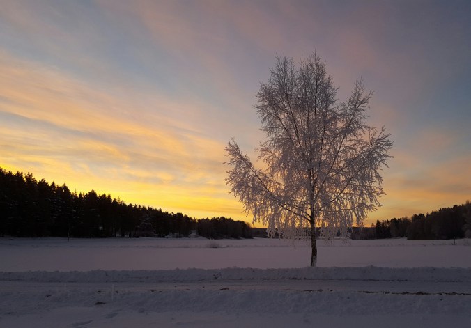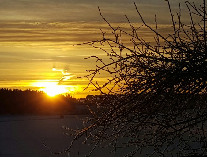 Soluppgång hemma på vår ”gata”.Imorse var jag uppe tidigt och åkte till stallet och fodrade hästarna. Bra det, då fick jag bland annat se solen gå upp. Det var fjorton minus och Atli och de andra hade rimfrost i skägget. Jag har ju inte varit hos Atli på ett tag, men nu när jag träffade honom kände jag hur mycket han betyder. De där stora ögonen med den varma blicken och den där mulen med en vit fläck på .. Blir också glad av doften av hösilage – det är något speciellt med stallmiljöer .