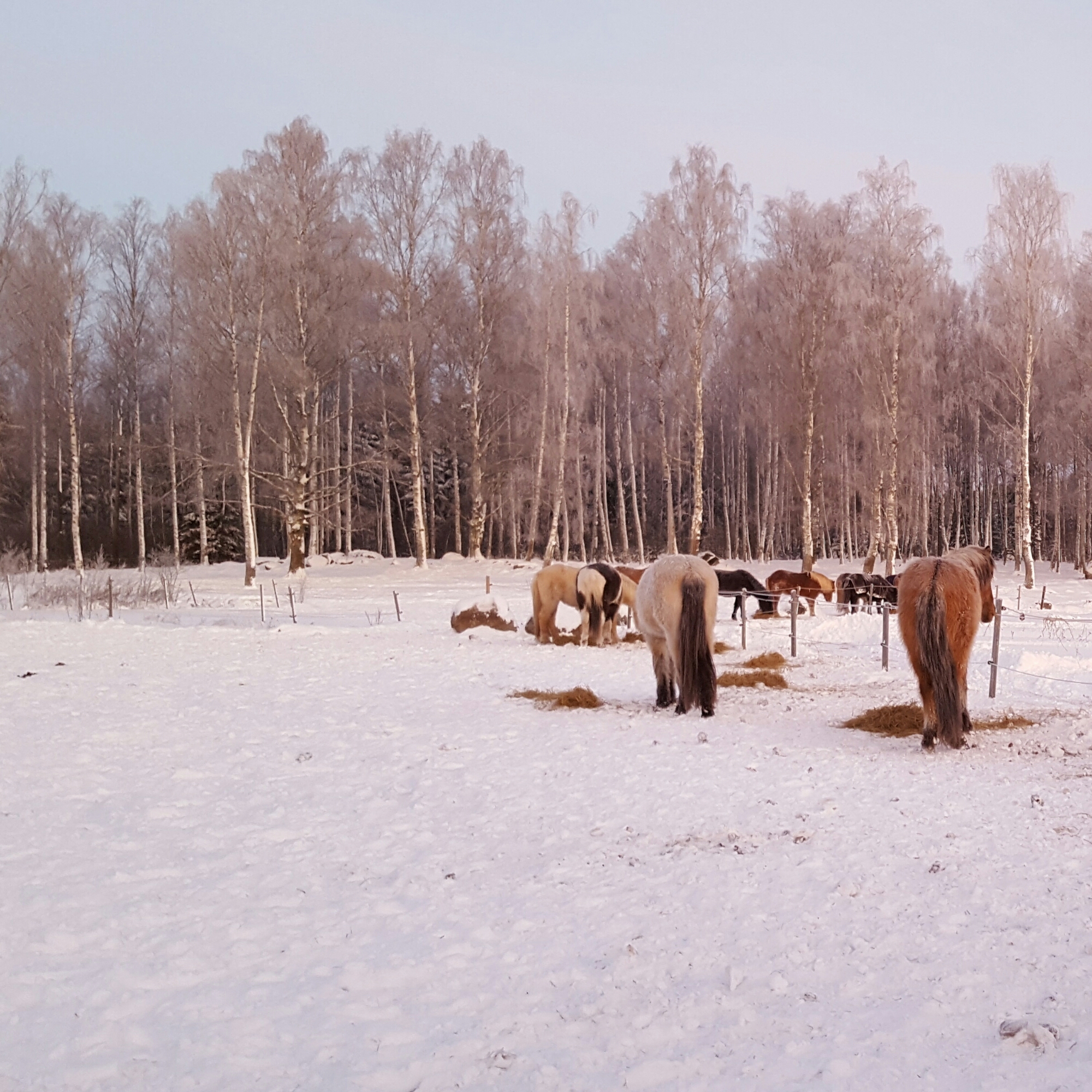 Väl framme stod hästarna på rad och väntade på mat, Atli var lite avvaktande – han har nog fått varit ”häst” lite för länge. Jag har ju inte ridit sen innan jul. Men nu får det bli en nystart– vill verkligen komma igång med ridningen!