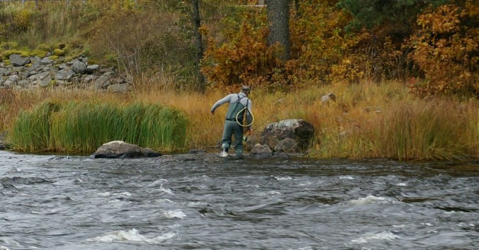 Man kunde både fiska och leva vildmarksliv längs med älven. Det fanns fina vindskydd och eldstäder med färdighuggen ved. Vilken service! På flera ställen stod husbilar parkerade, många fiskade med fluga i älven, vattnet var strömt på vissa ställen.