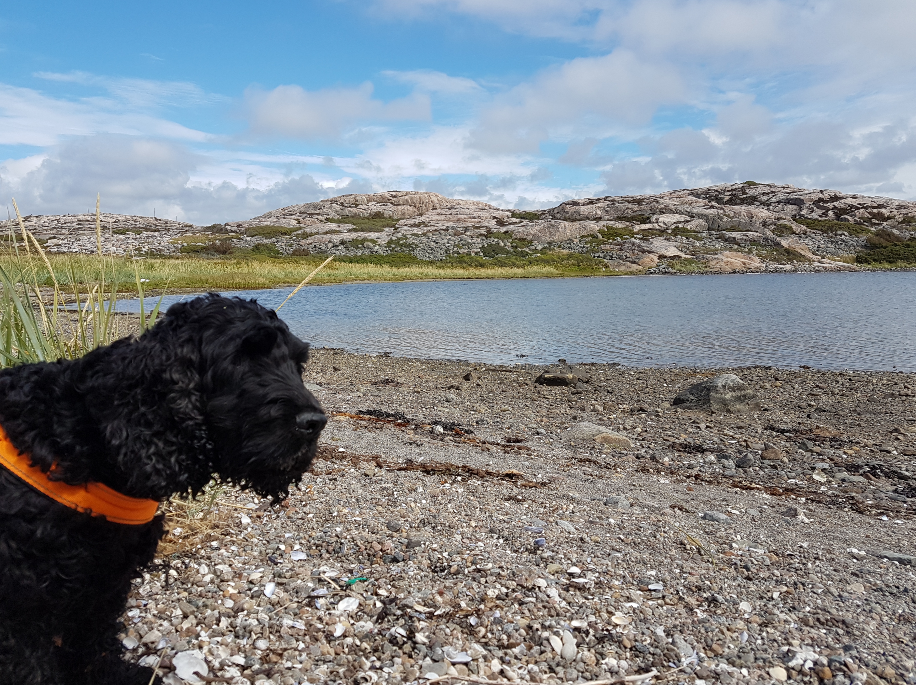 Idag har vi besökt Möns Klint – hittade ”rätt” väg denna gång. 500 trappsteg tog oss ner till stranden – där det var högvatten. Vi som ville besöka klienten från stranden bestämde oss för att vada i nån form av gyttja bestående av halvrutten blåstång. Det var bland det äckligaste jag varit med om, barfota i gyttja upp över knäna. Tror vi gick ca 50 meter innan vi hamnade på fast mark. Hundarna simmade bredvid, de fick ett välbehövligt bad efter detta.