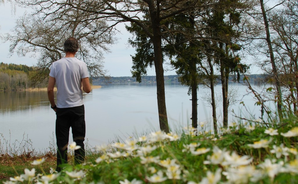 Pelle, Snöret och jag tog en lunchpromenad ner till vattnet. Nu är det verkligen vitsippornas tid. Idag var nog förresten årets första sommardag – det var riktigt varmt!