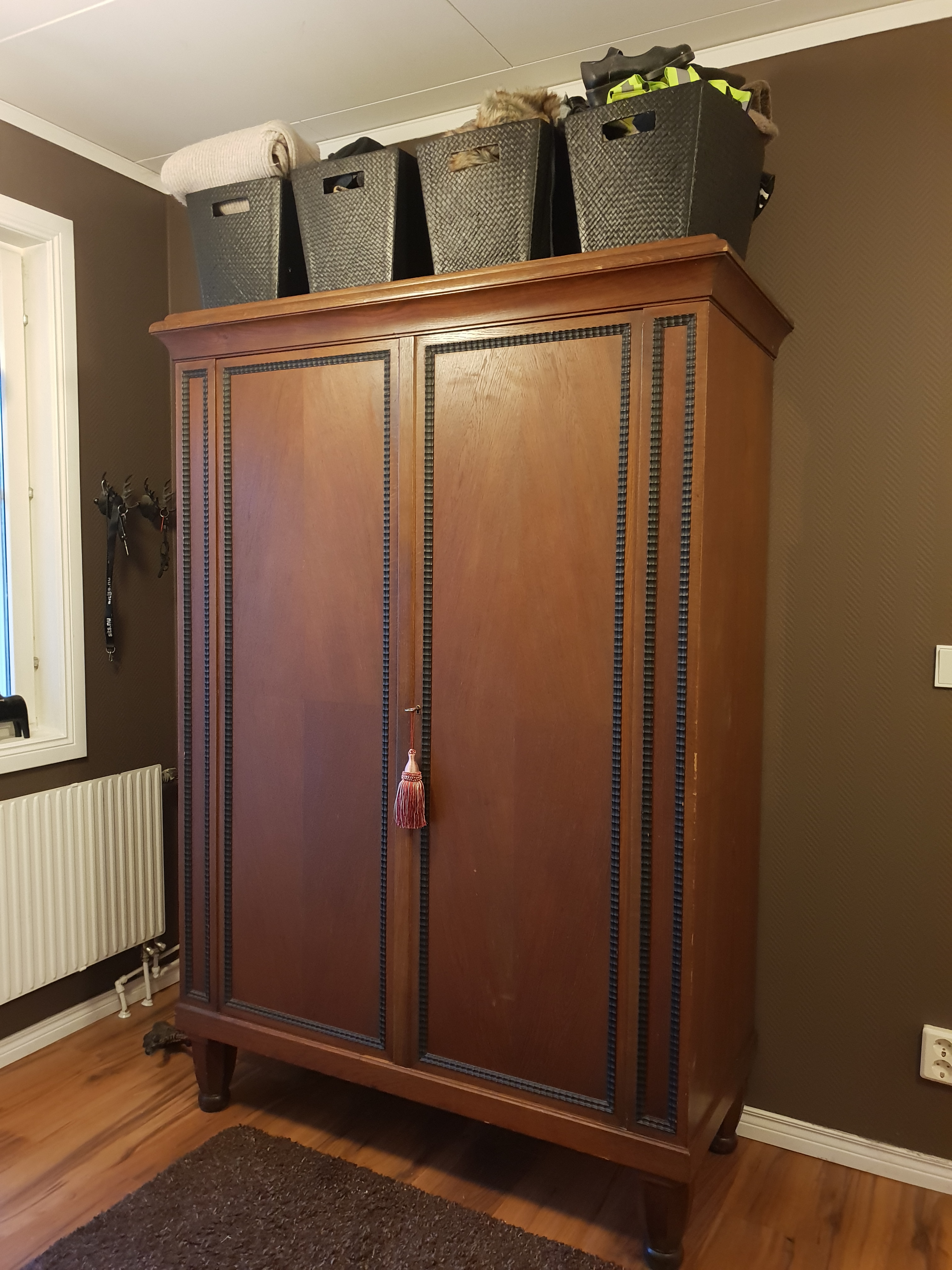 Väl på plats förstod vi varför skåpet i princip var gratis.. att få hem skåpet var ingen dans på rosor. Det kändes som att det vägde minst ett ton! Men med hjälp av en pirra och lite jävlar anamma så hamnade det på plats hemma hos oss. Det står där det står och nu kan vi njuta av en rejäl möbel i ek.