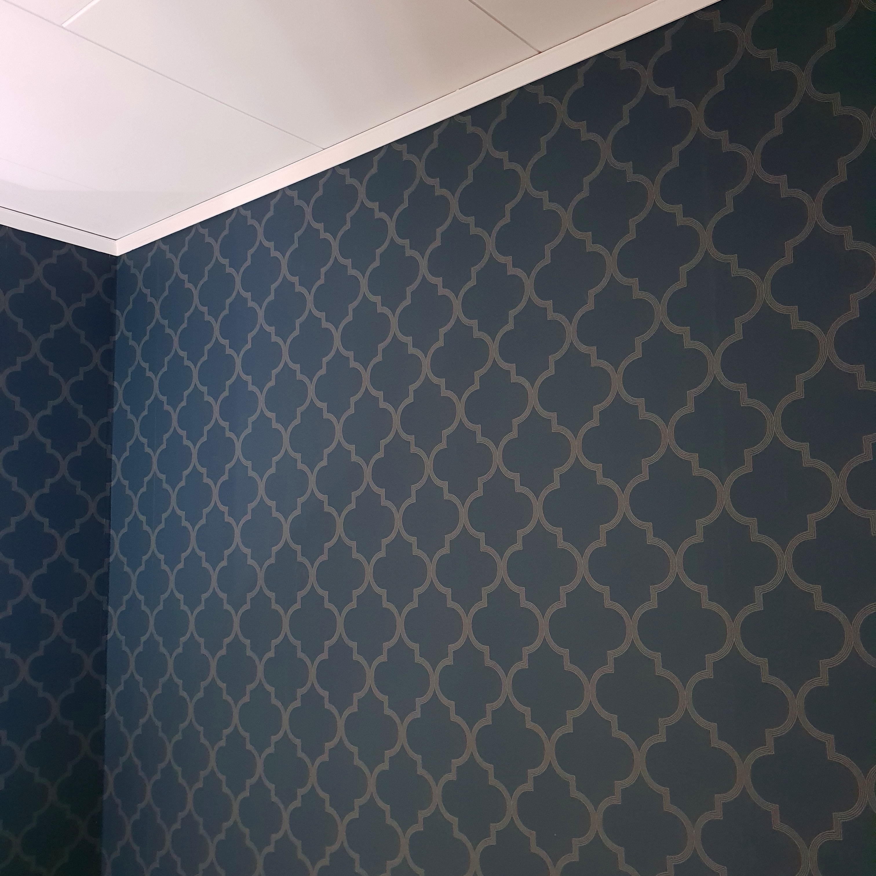 Jag tycker det blev jättefint, lite hotellkänsla. Vi håller det enkelt med få saker så det inte blir för personligt. Tapeten i rummet känns magisk, jag tror att blått är avkopplande och fint för själen..