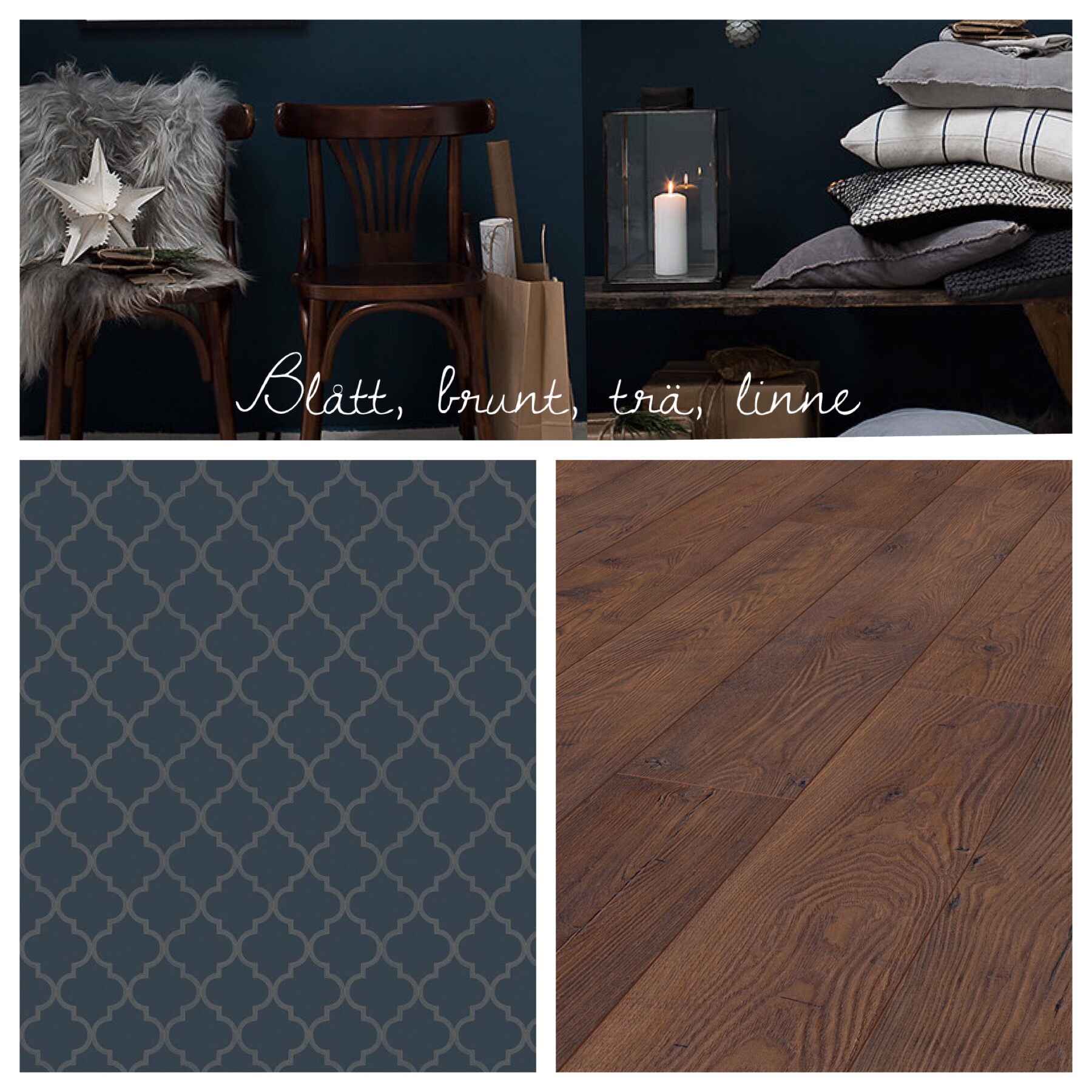 Idag var vi iväg och handlade golv till kontoret/gästrummet. Vi hade spanat in ett tjusigt och prisvärt mörkt trägolv på Byggmax. Dessvärre var det slutsålt överallt, så det blev faktiskt ett klickgolv från Bauhaus. Laminatgolv skulle vi inte ha, men nu blev det ett ändå. Det har ju hänt en del på den fronten de senaste åren. De känns ju inte alls sådär blanka och plastiga som de gjorde förr, plus att priset passade vår plånbok. En bild på tapeten, golvet och lite inspiration från Elle Decor, lånade bilder – fast mitt collage. Mörkt golv och mörka väggar blir finemang mot en och annan trädetalj eller linnetyg..