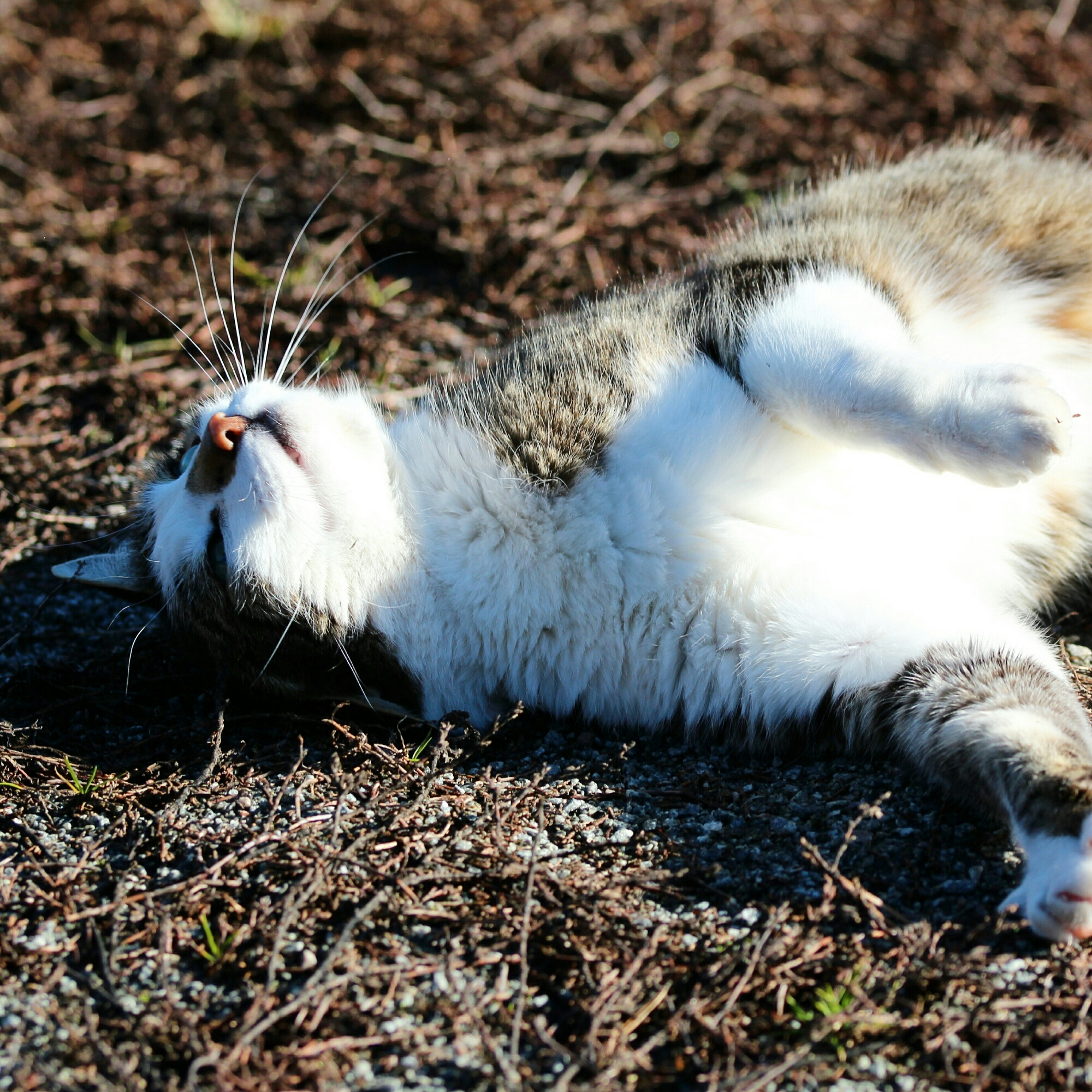 Snöret njuter i vårsolen. Mätt och belåten efter en portion Vov. Han älskar hundmat och tror nog att han är en Rottweiler eftersom han är uppvuxen med två sådana. Snöret är förresten halvbengal och det märks inte minst på hans goda självförtroende. En gång skrämde han iväg en närgången räv.