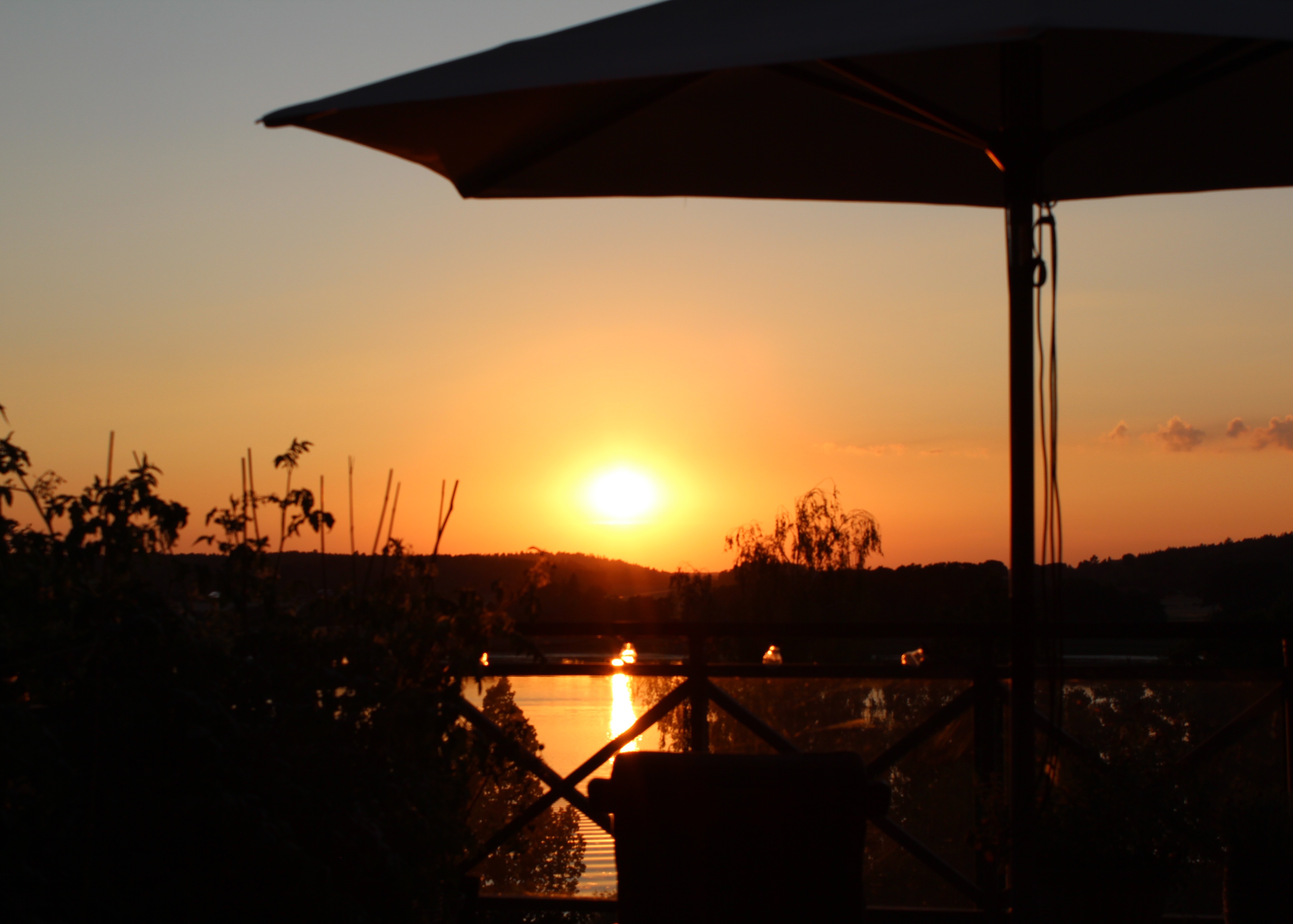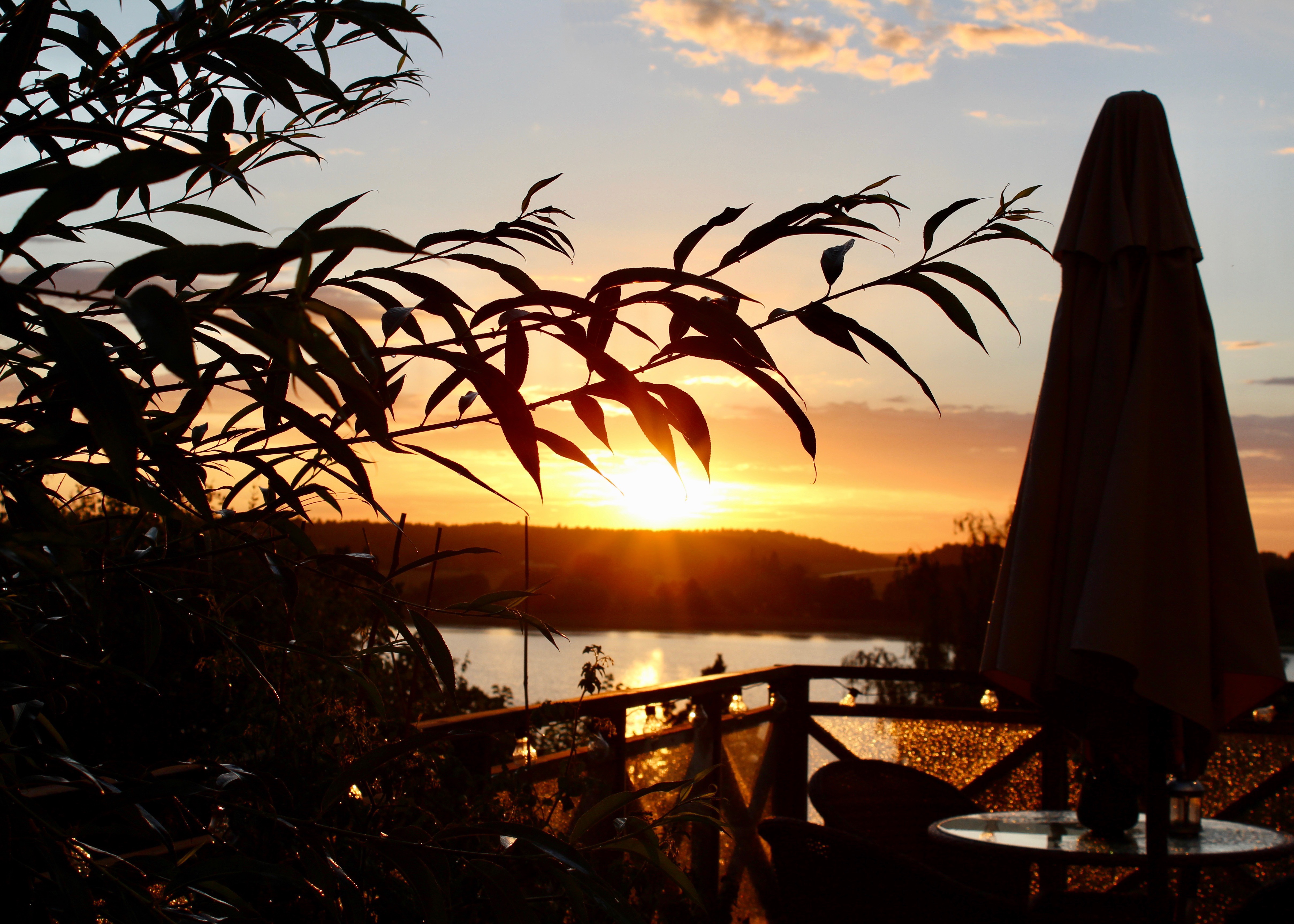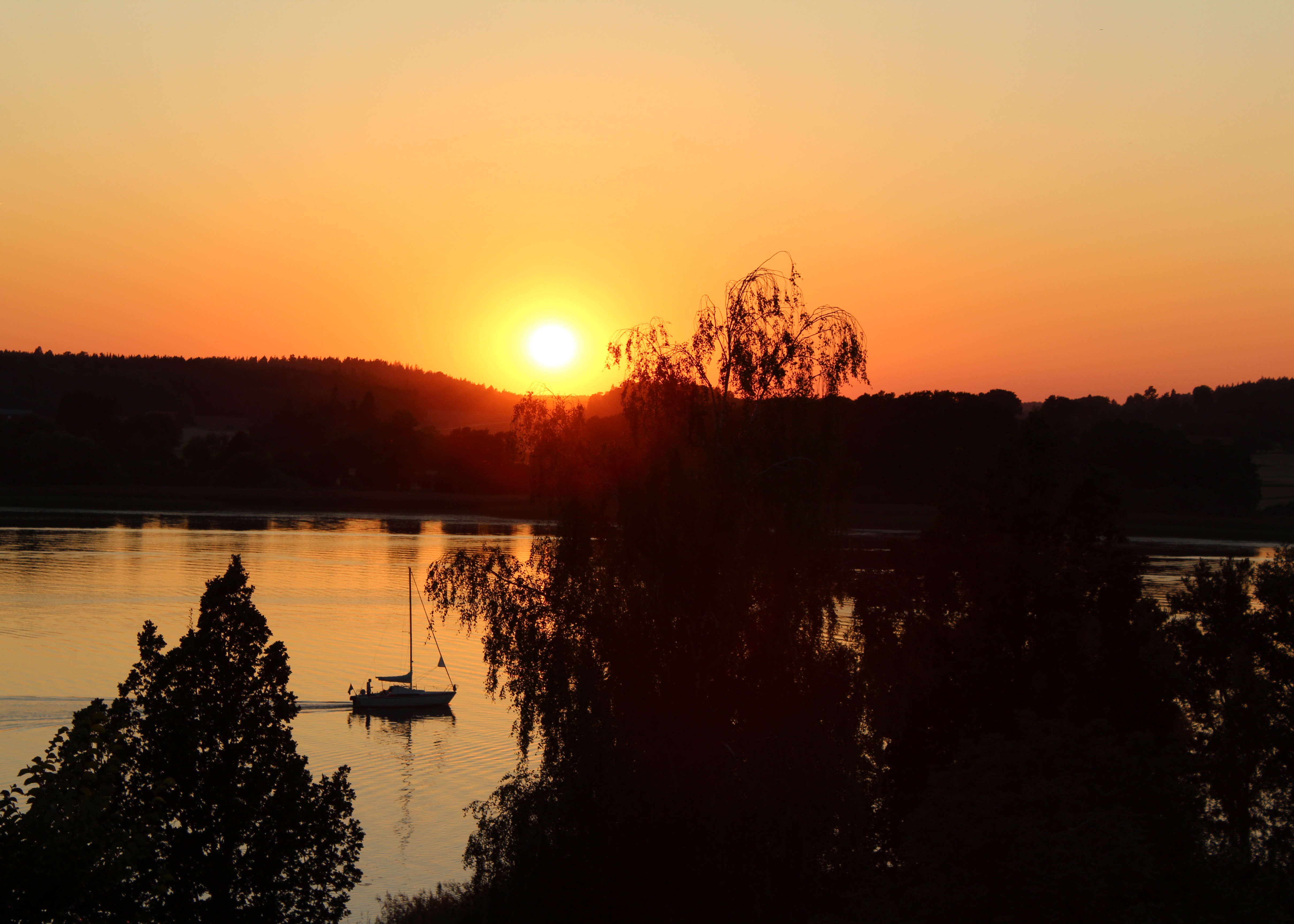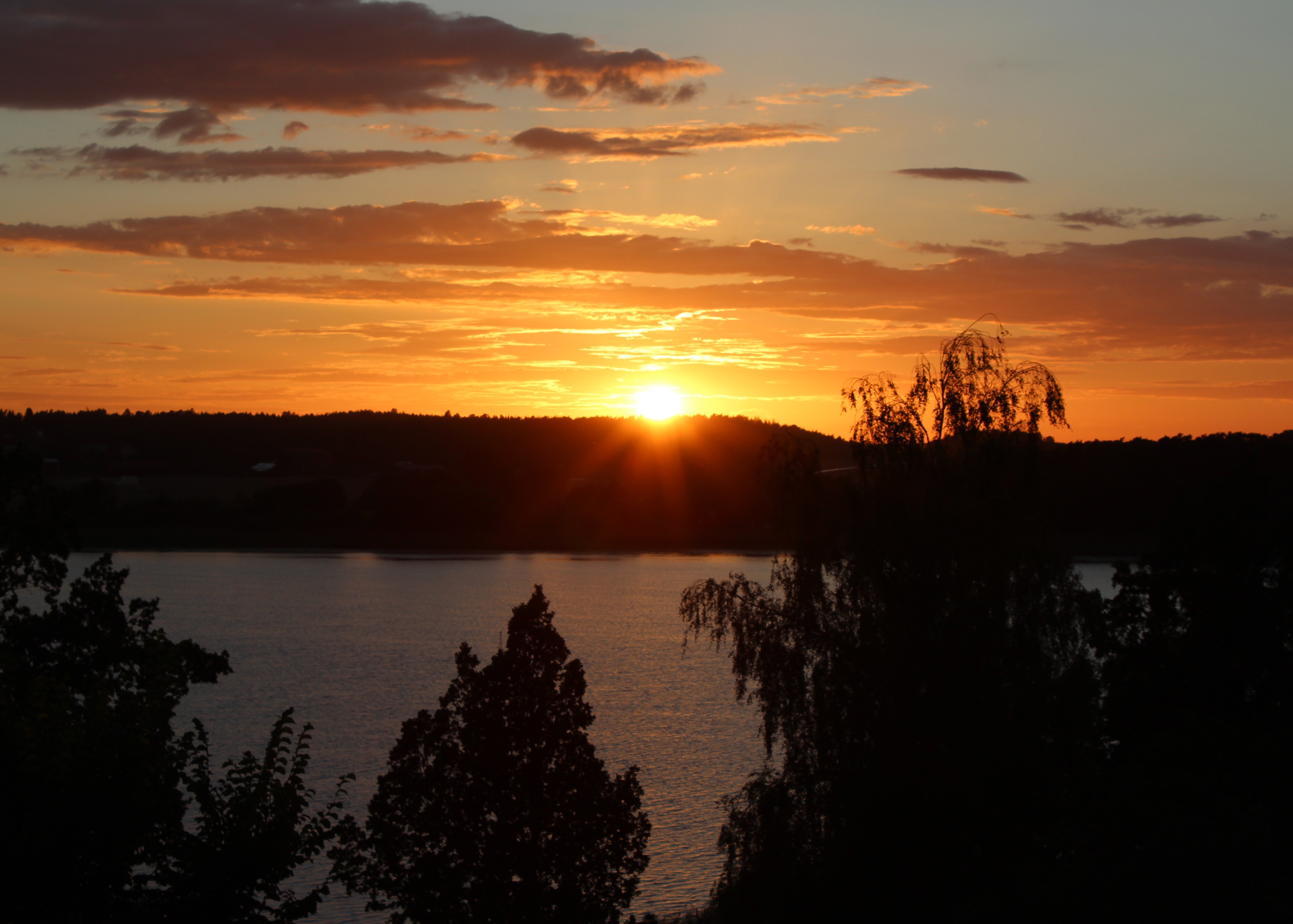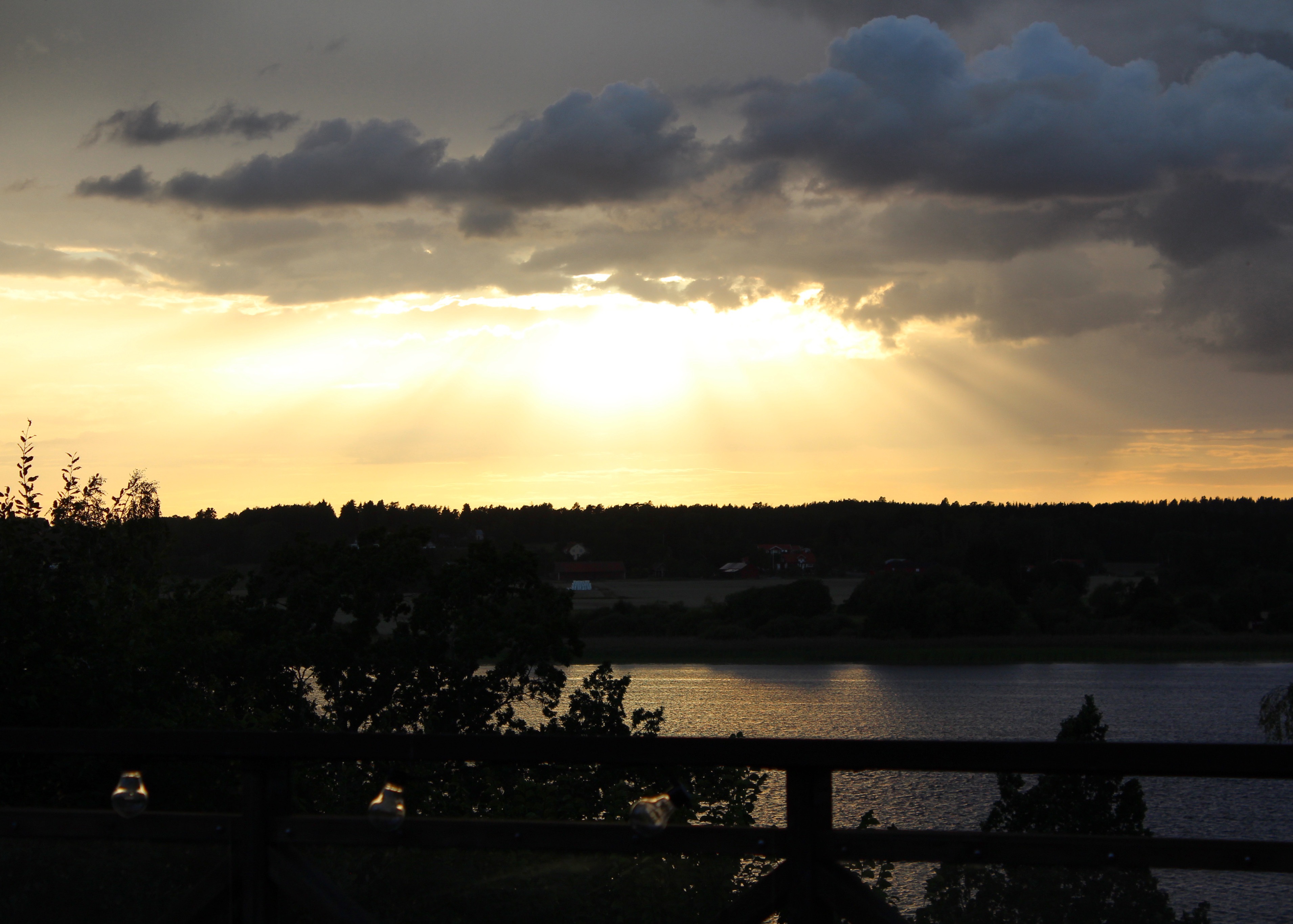 Inatt fick vi vara med om ett riktigt oväder. Det åskade och smällde rakt över vattnet. Lite rädda blev vi, men som Tor var, jag menar tur var – inga nedslag just här. Som kompensation (?) fick vi njuta av en vacker solnedgång ikväll. Älskar detta ställe!