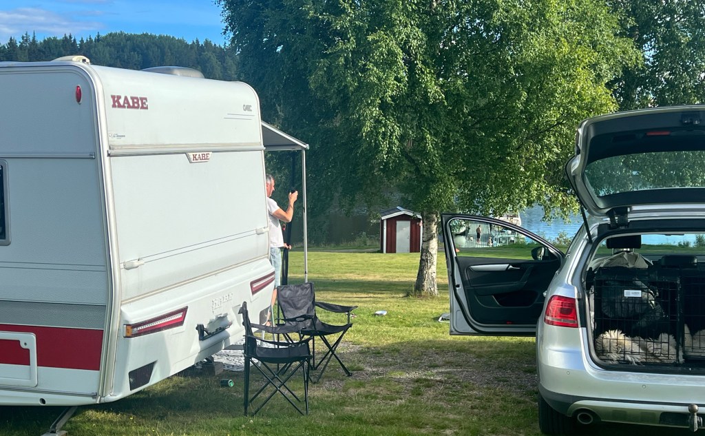 Så landade vi på Villa Gladtjärn en liten camping utanför Smedjebacken. Det var våra vänner som hade bokat campingen – och vi blev glatt överraskade när vi såg hur fint det var. Dessutom fick vi en jättebra plats med sjöutsikt.