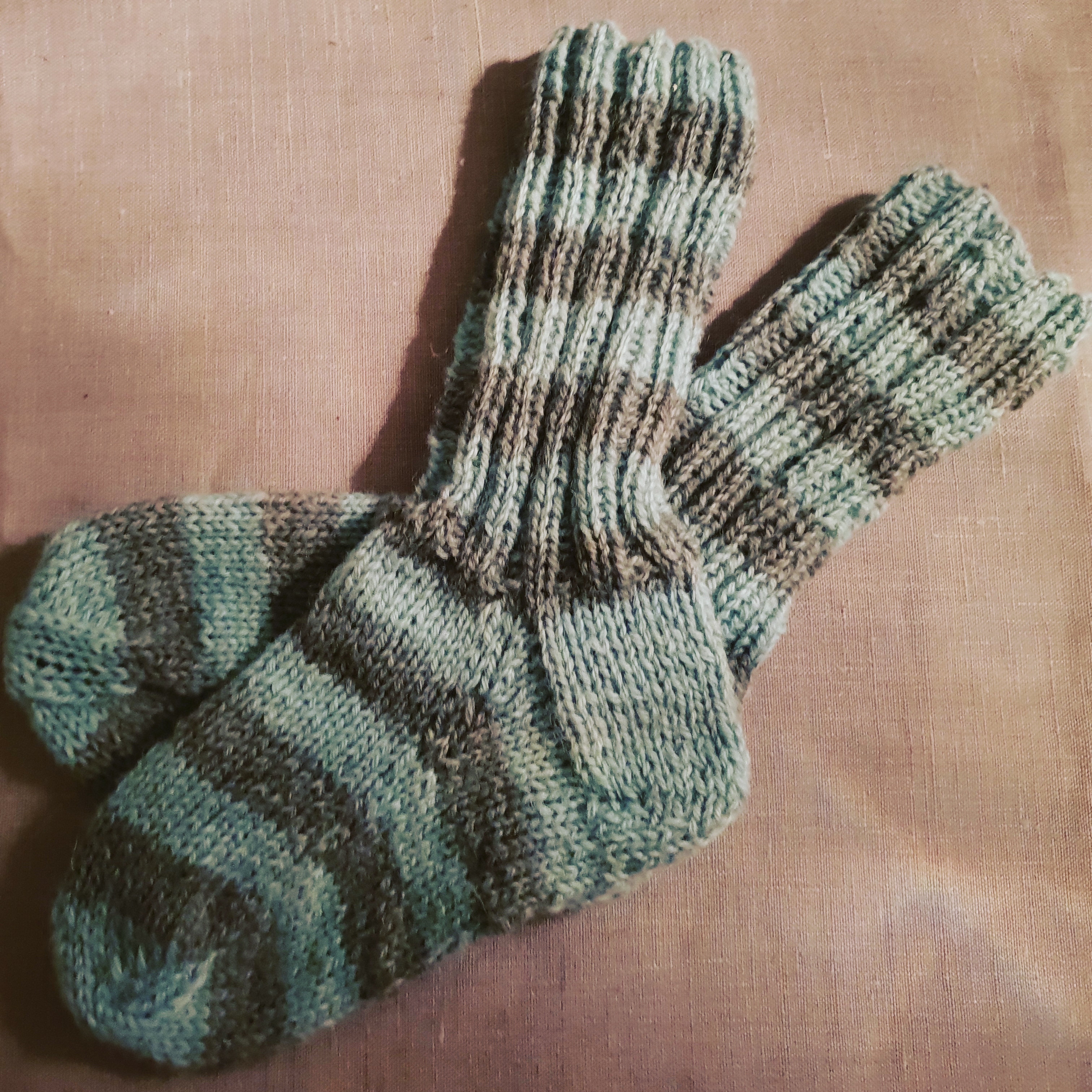 Sist när vi var på loppis i Norrköping så hittade jag ju växtfärgat ullgarn, flera härvor. Nu är första paret randiga raggsockor klara. Jag älskar att blåsa liv i gamla saker. Pelle har redan paxat dem.. annars hade de nog blivit en julklapp till någon. Denna gång stickade jag på fri hand, inget mönster. Jag har knäckt koden för avmaskningen av hälen.. Förresten är det nyttigt för själen att sticka läste jag. Mindfulness – här och nu när handen får jobba och hjärnan kan vila..