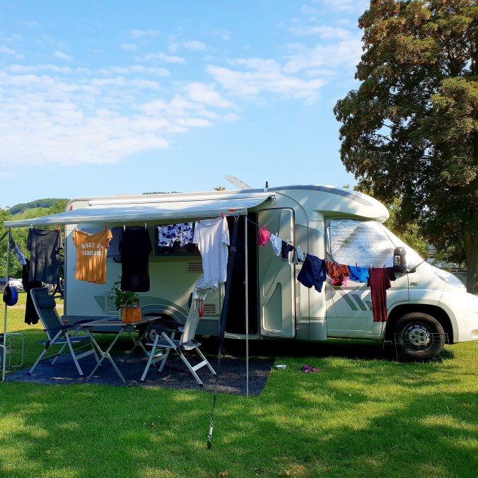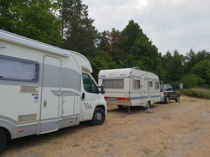 Ställplatsen är helt okej – en farbror och hans fru som upplåtit sin tomt. Vi står tillsammans med ca 10 andra husbilar/husvagnar här. Nu har vi precis skrivit i en gästbok som vi fick av Wolfgang som ägaren heter. Nu sova – sen mot Sverige imorgon.