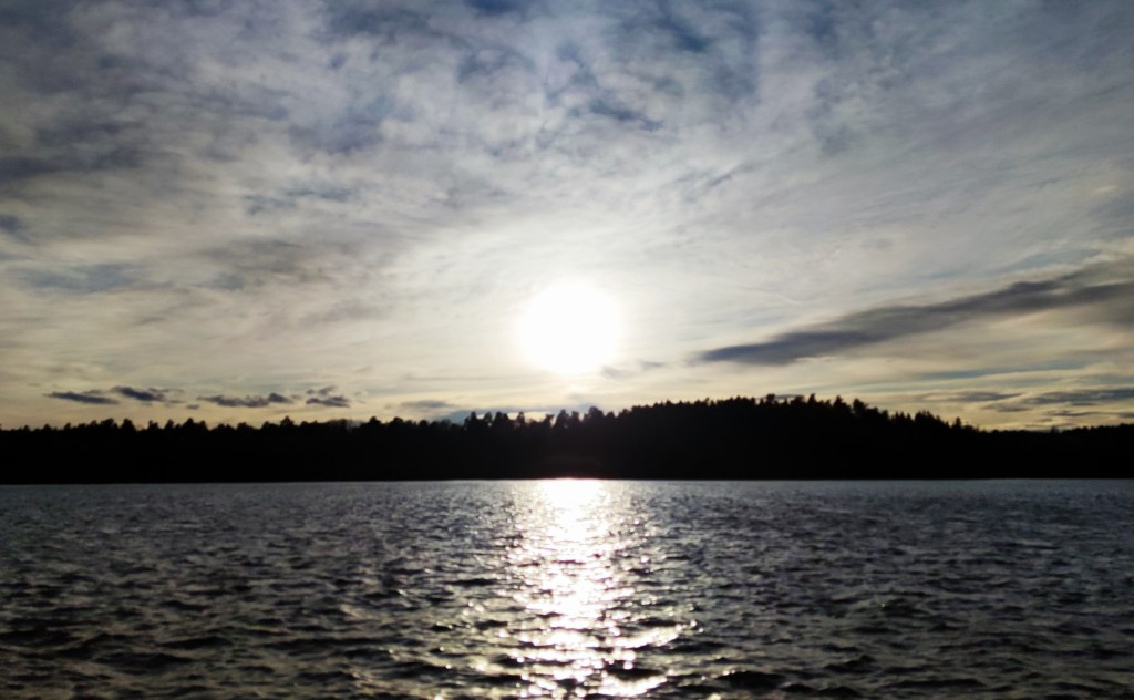 Inatt fick vi vara med om ett riktigt oväder. Det åskade och smällde rakt över vattnet. Lite rädda blev vi, men som Tor var, jag menar tur var – inga nedslag just här. Som kompensation (?) fick vi njuta av en vacker solnedgång ikväll. Älskar detta ställe!